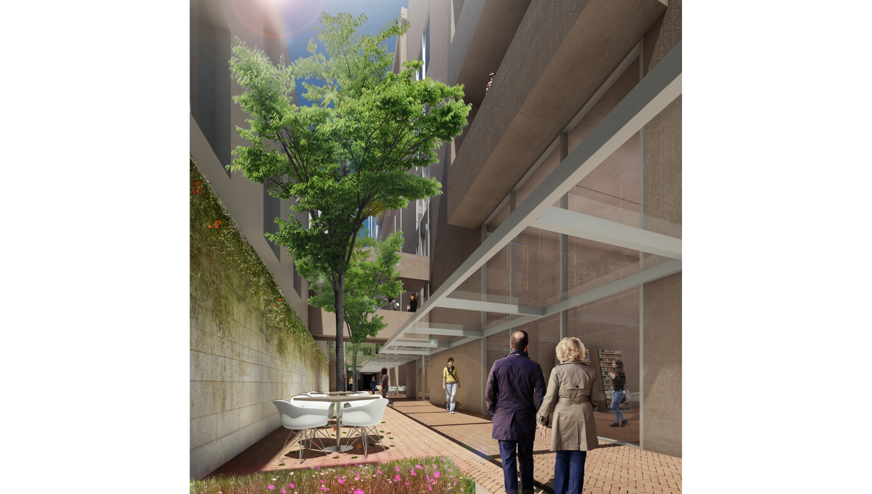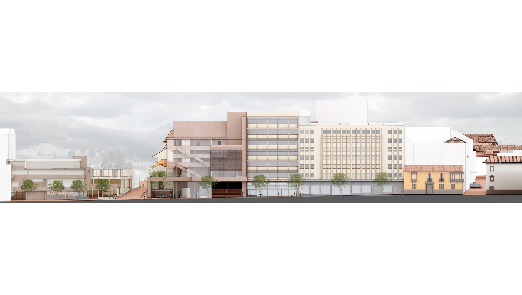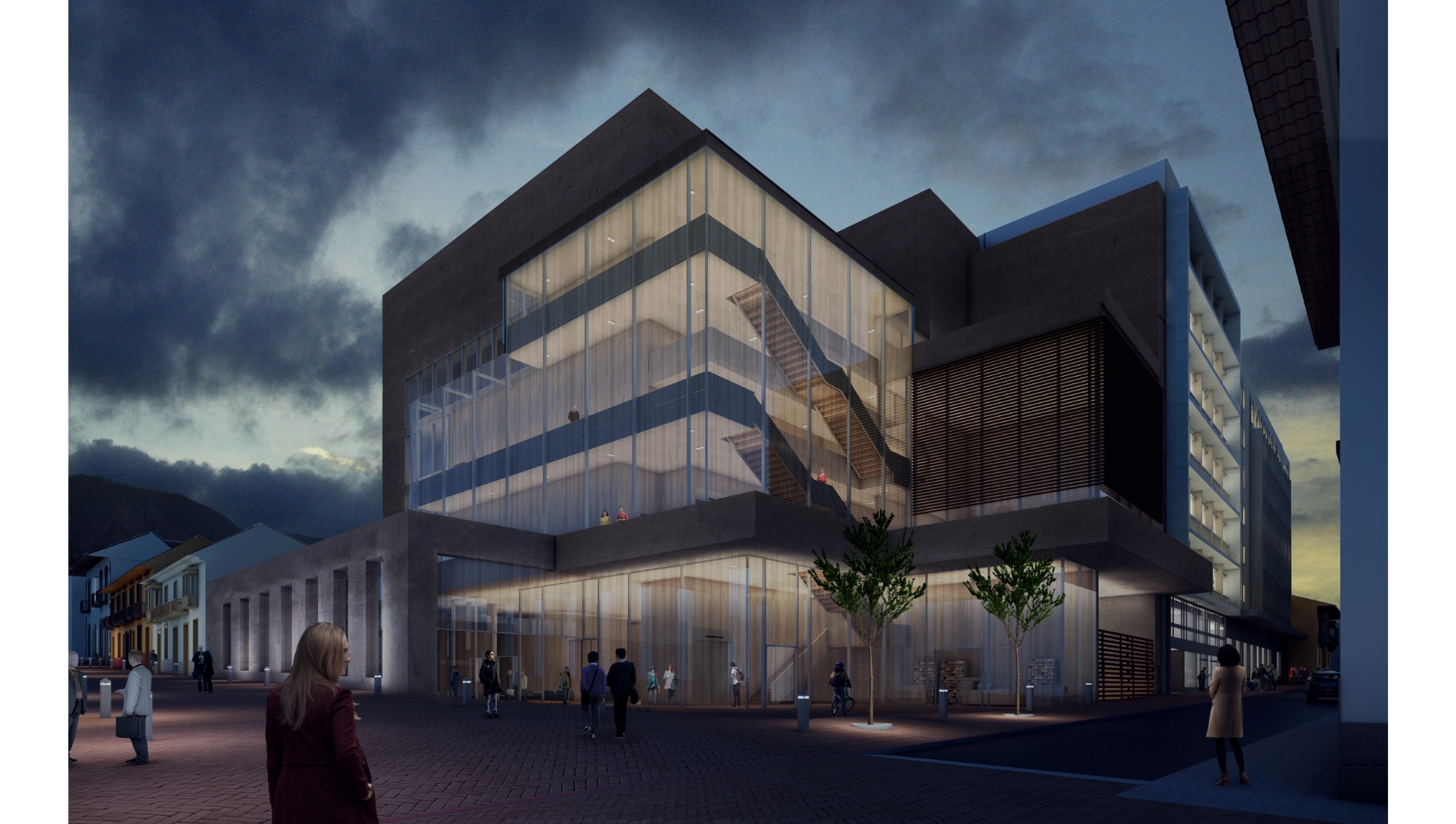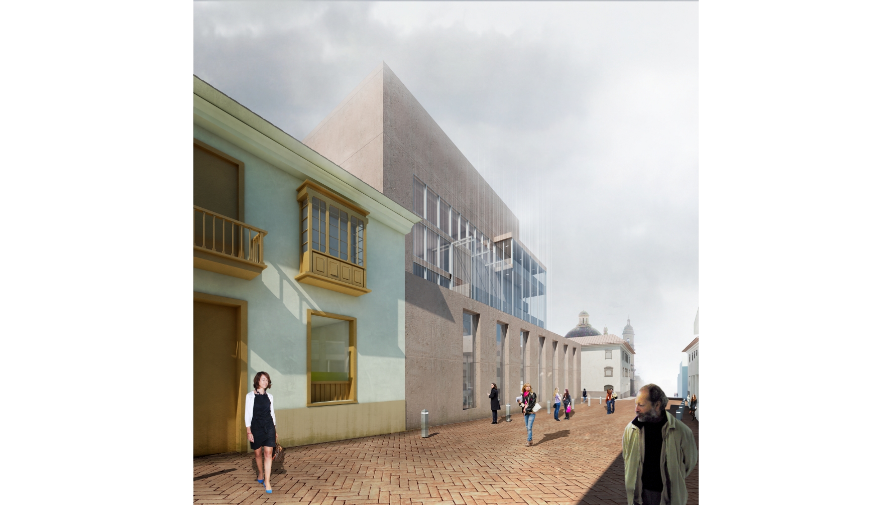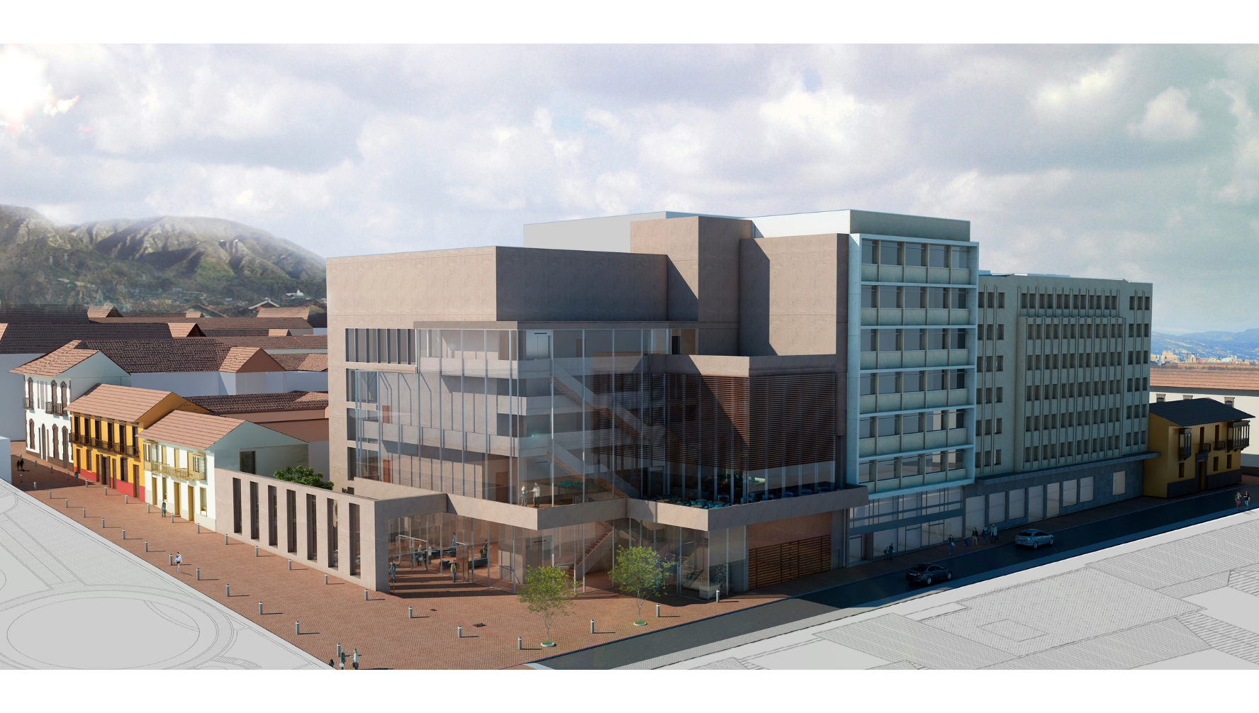 Por su localización el proyecto debe resolver el empate de dos condiciones normativas y urbanísticas que definen formas y proporciones de espacio público diferentes. Por la carrera 6ª debe empatar con edificios de gran altura (7 pisos o más, andenes amplios y voladizos a 4 m de altura y de 3 m de ancho). En cambio, por la calle 11 debe empatar con la paramentación colonial, con construcciones de 2 pisos, 6 o 7 m de altura, andenes y vías estrechas y con aleros de 1 a 1.2 m. En la carrera 6ª, el sistema de aleros propuesto conecta las áreas de recibo exterior con los voladizos del edificio de la Universidad Autónoma y del edificio Stella, consolidando el perfil urbano de la ciudad de la mitad del siglo XX y se abre la esquina de la calle 11 con carrera 6 con el fin de fortalecer y consolidar las fachadas de la Catedral, las viviendas coloniales y el centro cultural Gabriel García Márquez. Sobre la calle 11, el proyecto plantea una continuidad al paramento constituida por un plano de fachada que no supera la altura del alero de las construcciones antiguas y proyecta una abstracción de los vanos de las fachadas coloniales. Esta condición fortalece y consolida la perspectiva de la fachada urbana sobre la calle 11. Este muro perforado garantiza la reconformación de los paramentos de la calle y a su vez conformará un espacio de recibo exterior que aísla el edificio de mayor altura, necesario para incluir el programa solicitado. Se puede decir que esta paramentación opera como una celosía que sin desconformar definitivamente la calle que permitirá percibir el edificio contemporáneo que está detrás y el pasaje hacia el centro de manzana.