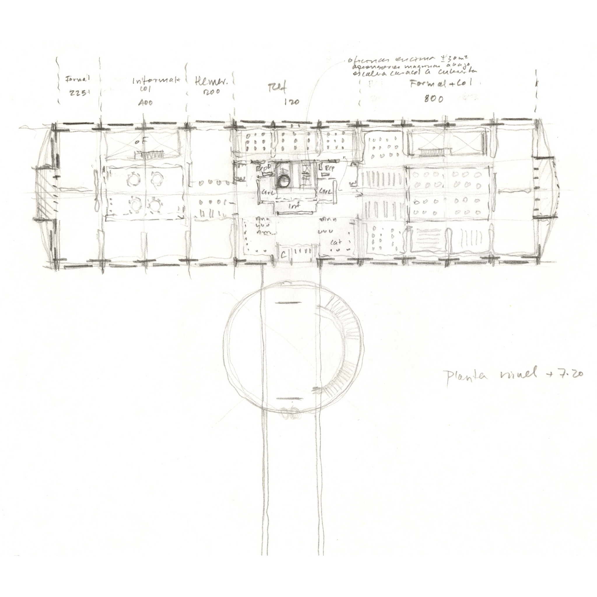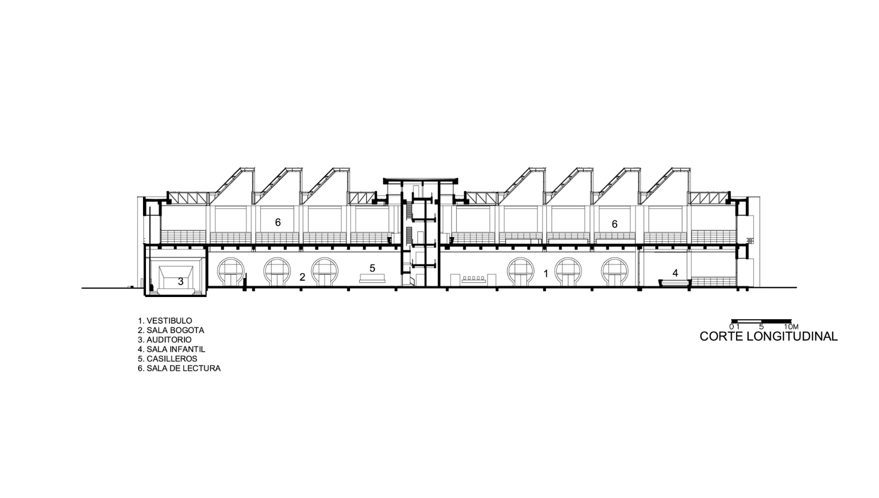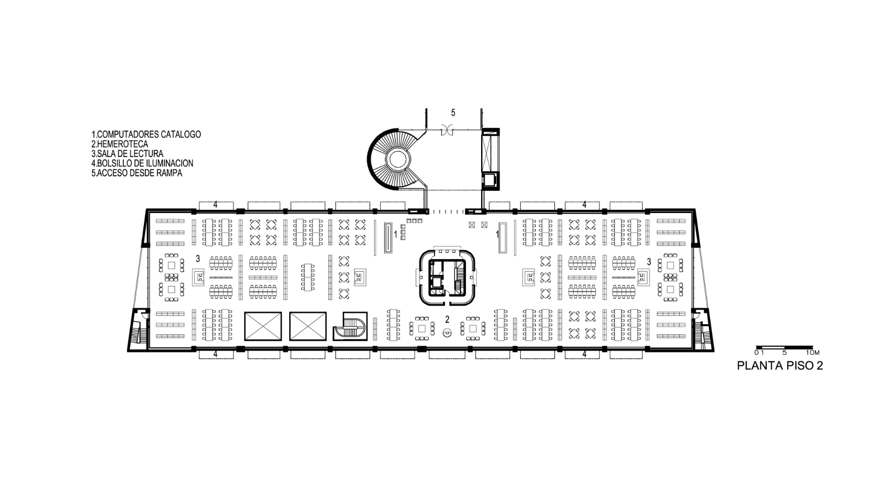 En el segundo piso se creó una gran sala de lectura de siete metros de alto coronada por siete enormes claraboyas que reciben del norte la máxima iluminación natural, sin asoleamiento. El gran espacio está flanqueado por una secuencia de bolsillos de luz que garantizan óptimos niveles de iluminación y cuenta además con dos ventanales que enmarcan de modo selectivo los rasgos más notables del paisaje lejano: la sabana y los cerros. Puesto que las instalaciones y servicios están resueltos al interior de un punto fijo central, la planta está completamente despejada garantizando una absoluta flexibilidad, asà como una notable amplitud visual y espacial.