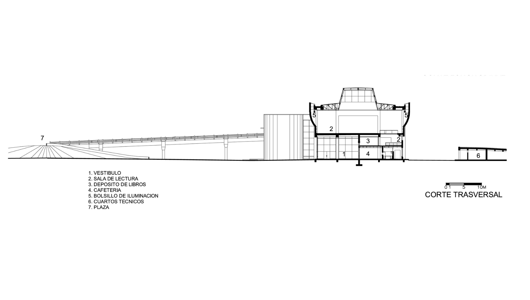 Un gran viaducto de 75 metros de largo que permitÃa la descarga de basura a los compactadores se convierte en el mecanismo para anunciar y dar acceso al primer y segundo piso de la Biblioteca y en un elemento de actividad y mediación con el parque.