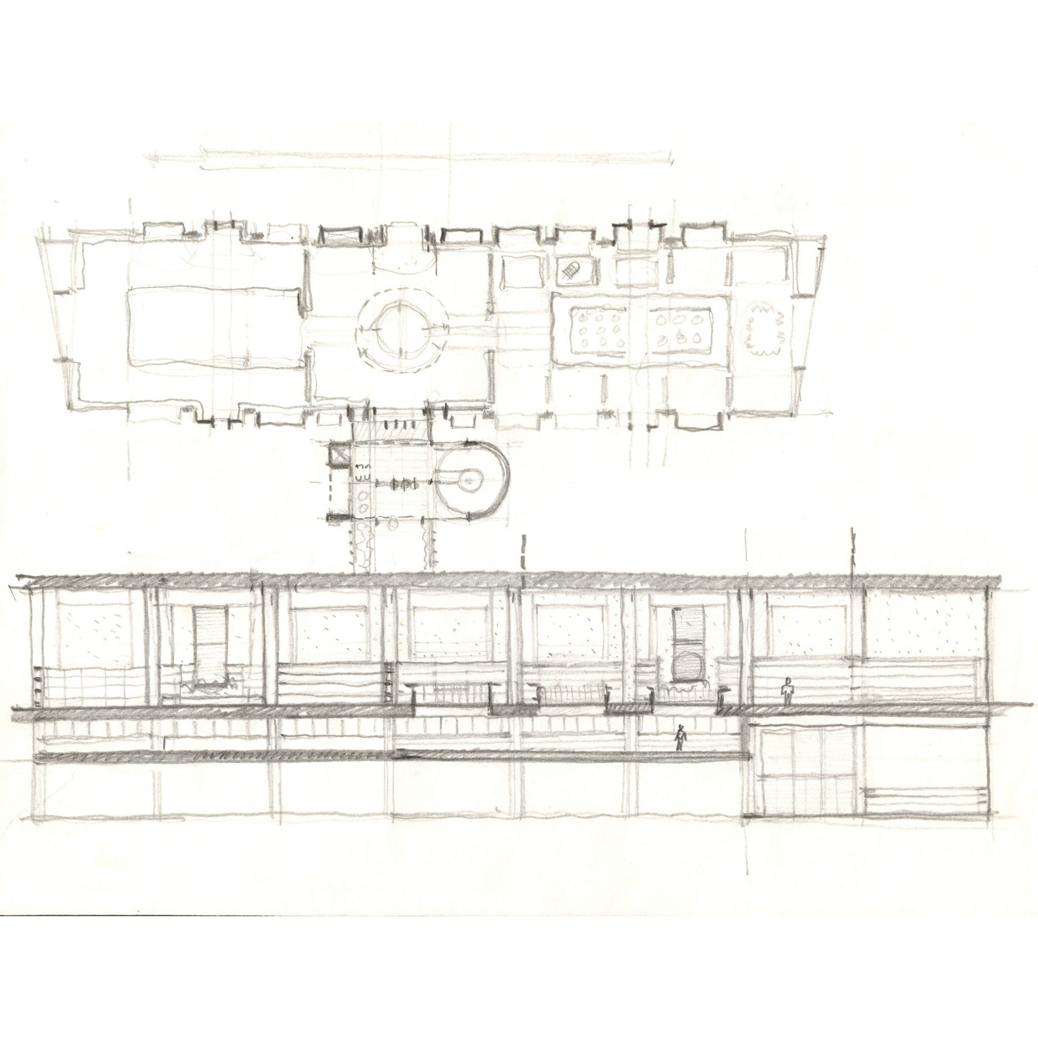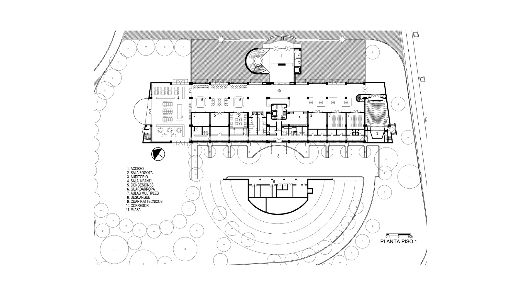 El primer piso consta de un gran corredor, delimitado por una secuencia de ventanales y horadaciones circulares, que comunica a diversas dependencias y que remata por un extremo con un auditorio y por el otro con una sala infantil. Conservando los vacÃos de las tolvas originales, el edificio cuenta con un mezanine para albergar oficinas, la sonoteca y la videoteca. La zona técnica se encuentra fuera del bloque principal y conduce directamente a la columna central de circulaciones y canalizaciones verticales logrando un máximo de eficiencia. Todo el concreto gris de la estructura original se preservó y los elementos estructurales y arquitectónicos nuevos se fundieron en concreto claro y posteriormente se abujardaron para resaltar el agregado calizo que refleja la luz con gran intensidad.