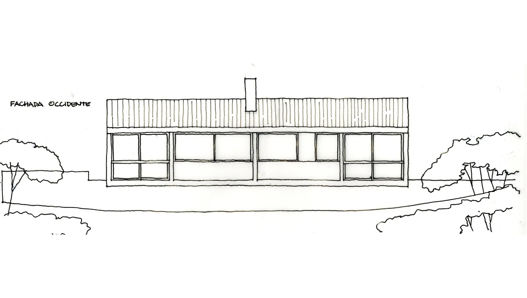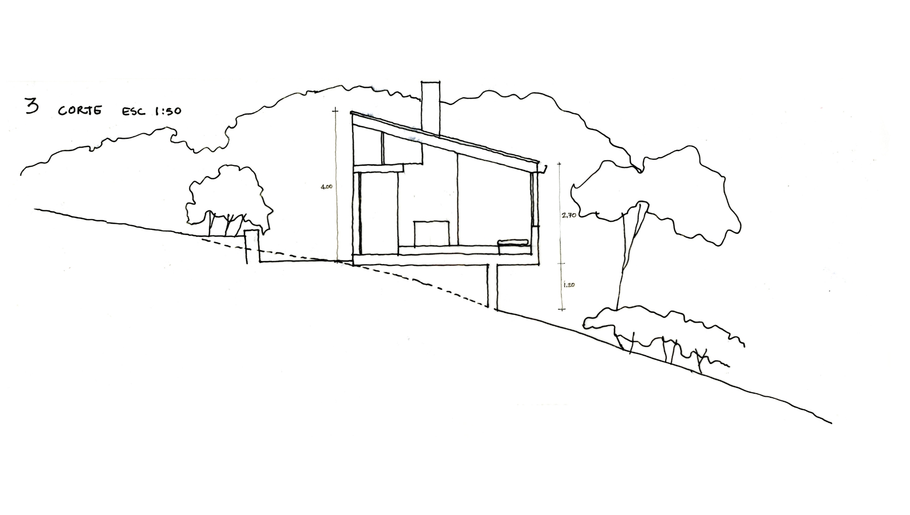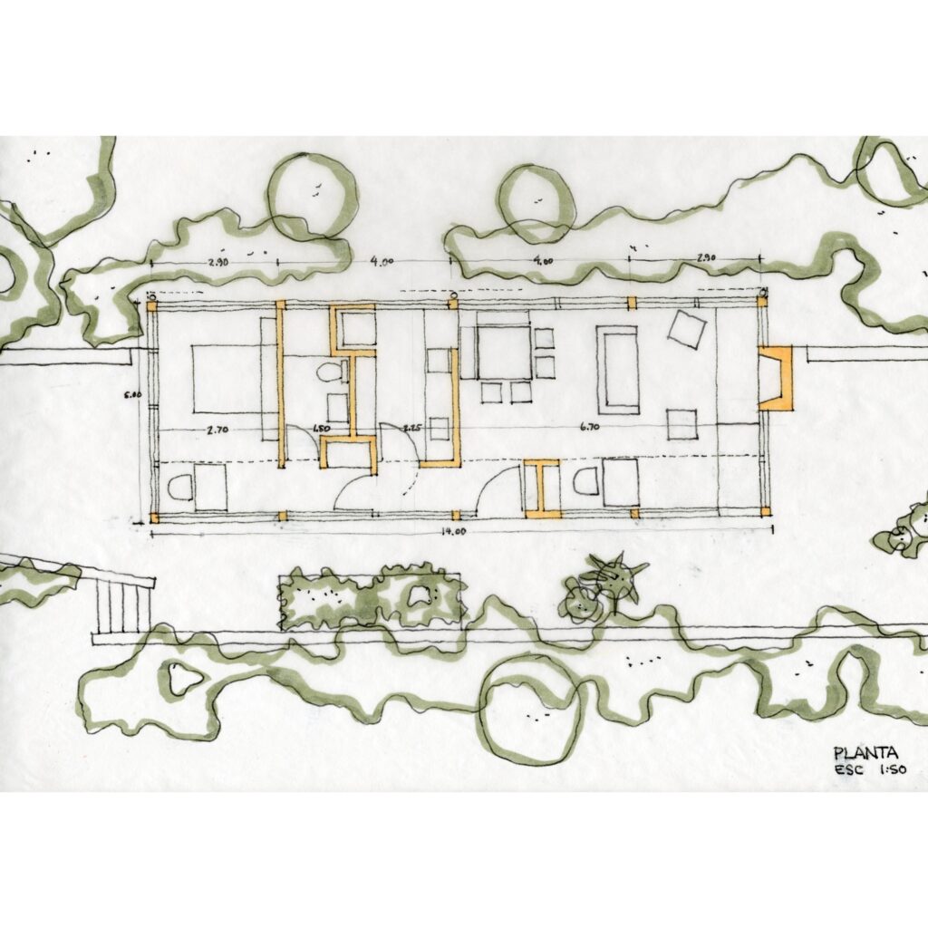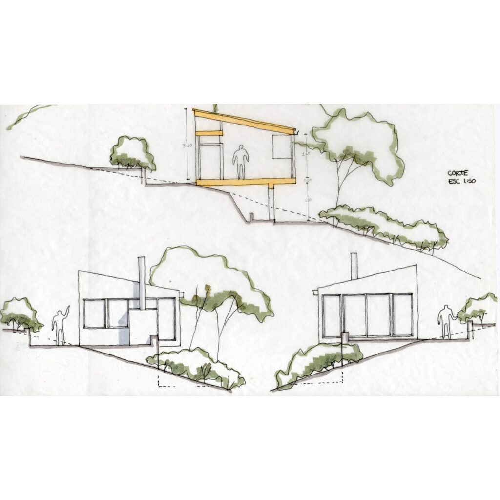 El proyecto consiste en una barra de 5mt de ancho por 14mt de largo y un solo nivel con amplios ventanales hacia las vistas lejanas. La cubierta liviana, de teja metálica termoacústica, se construye a un agua mimetizando la pendiente natural del lote. La casa cuenta con una habitación, una zona húmeda de baño y cocina y un espacio social con chimenea.