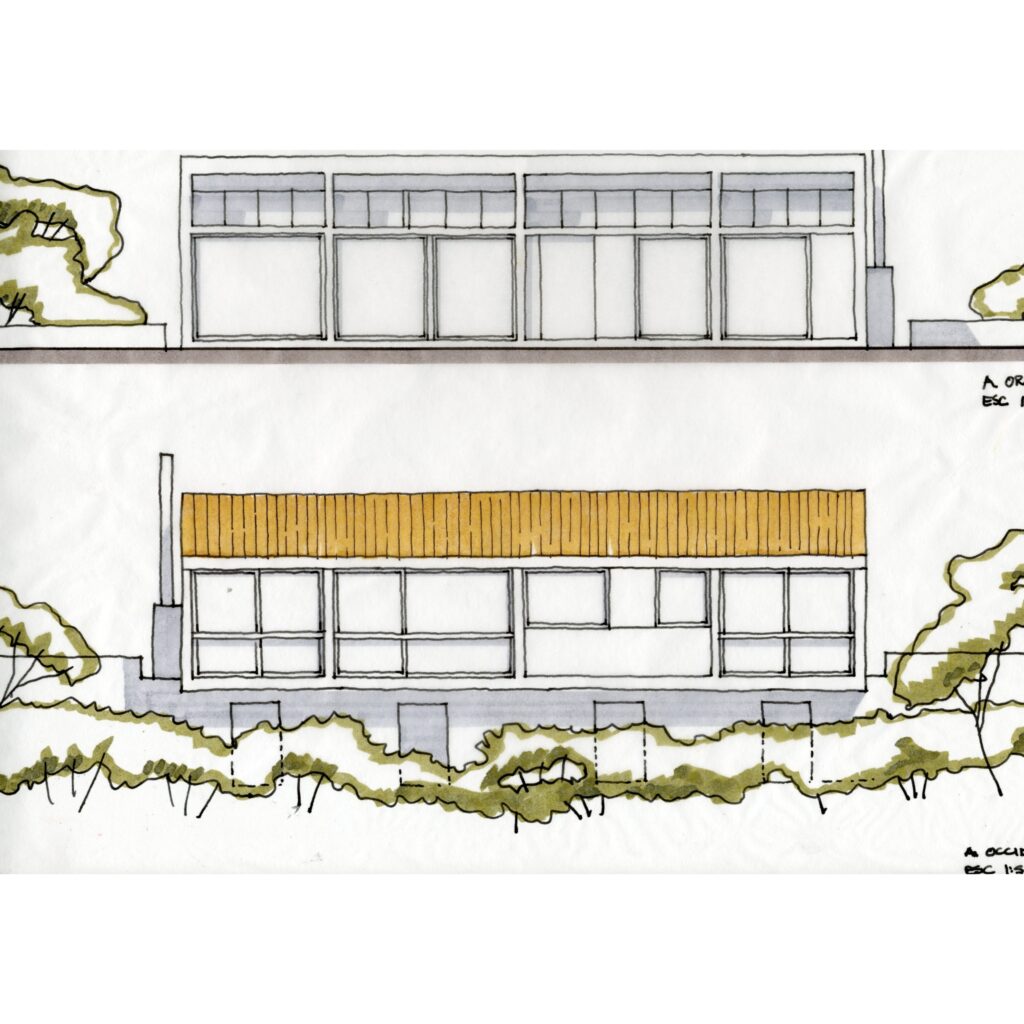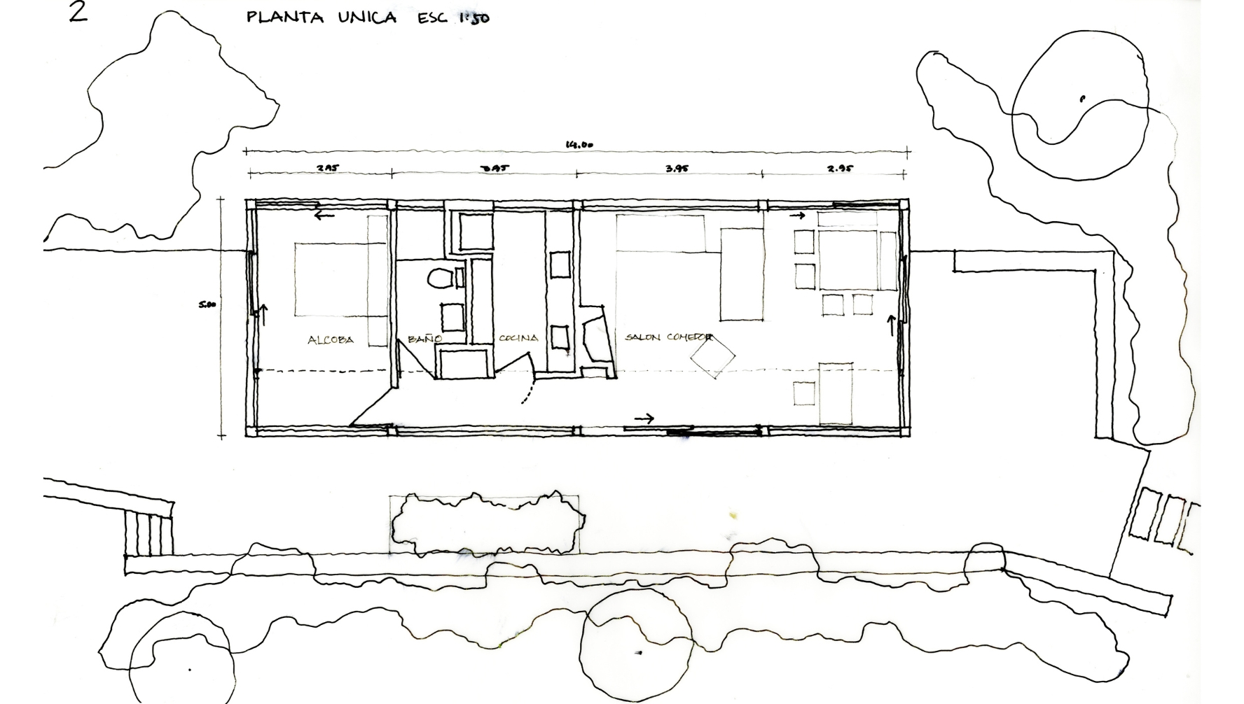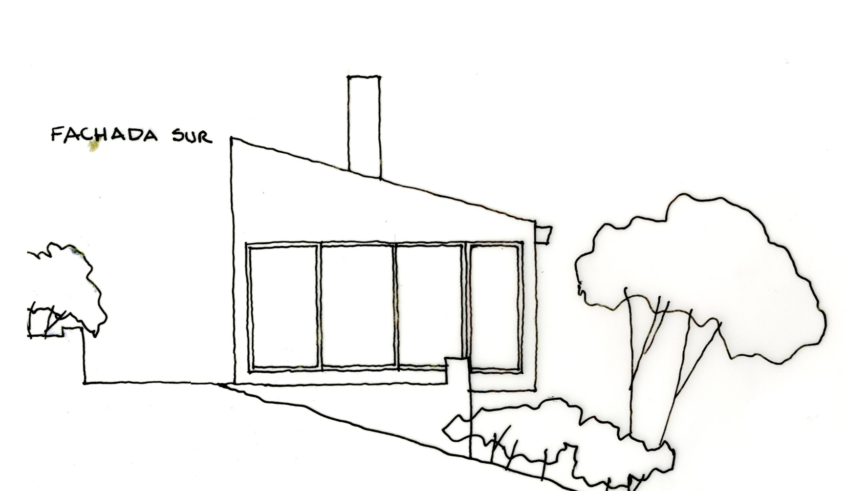 El proyecto consiste en una barra de 5mt de ancho por 14mt de largo y un solo nivel con amplios ventanales hacia las vistas lejanas. La cubierta liviana, de teja metálica termoacústica, se construye a un agua mimetizando la pendiente natural del lote. La casa cuenta con una habitación, una zona húmeda de baño y cocina y un espacio social con chimenea.