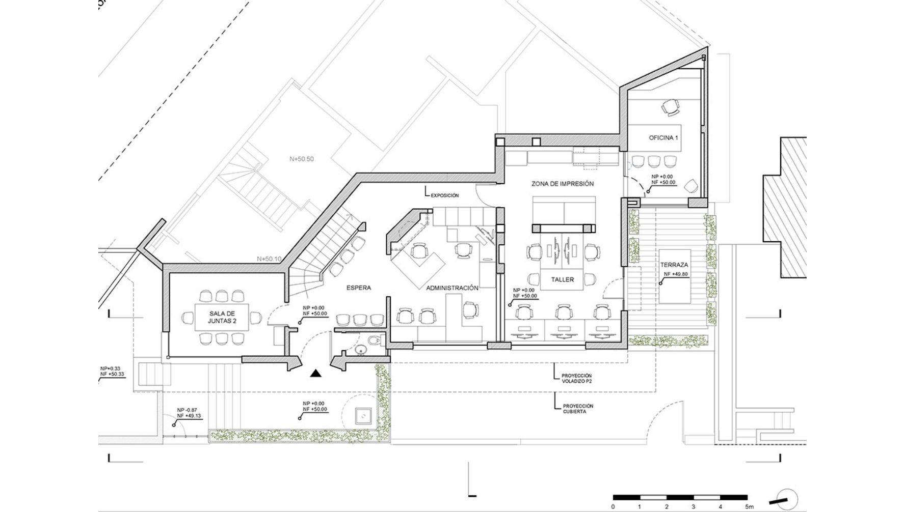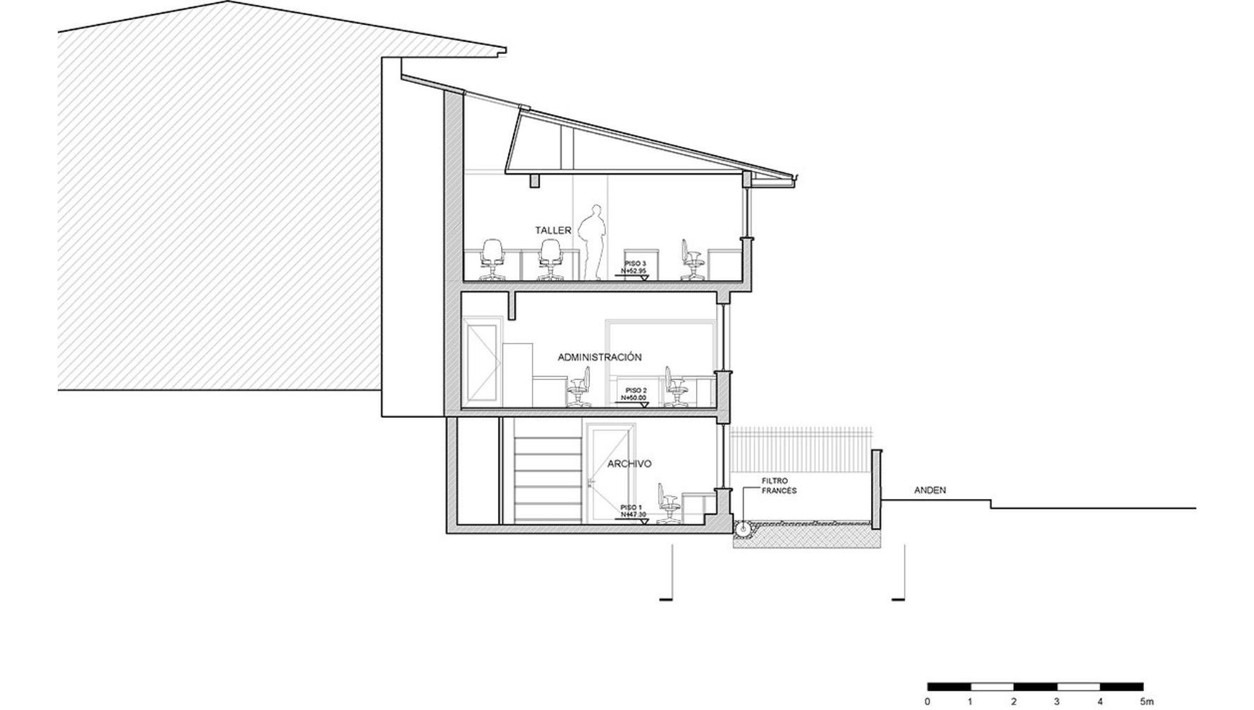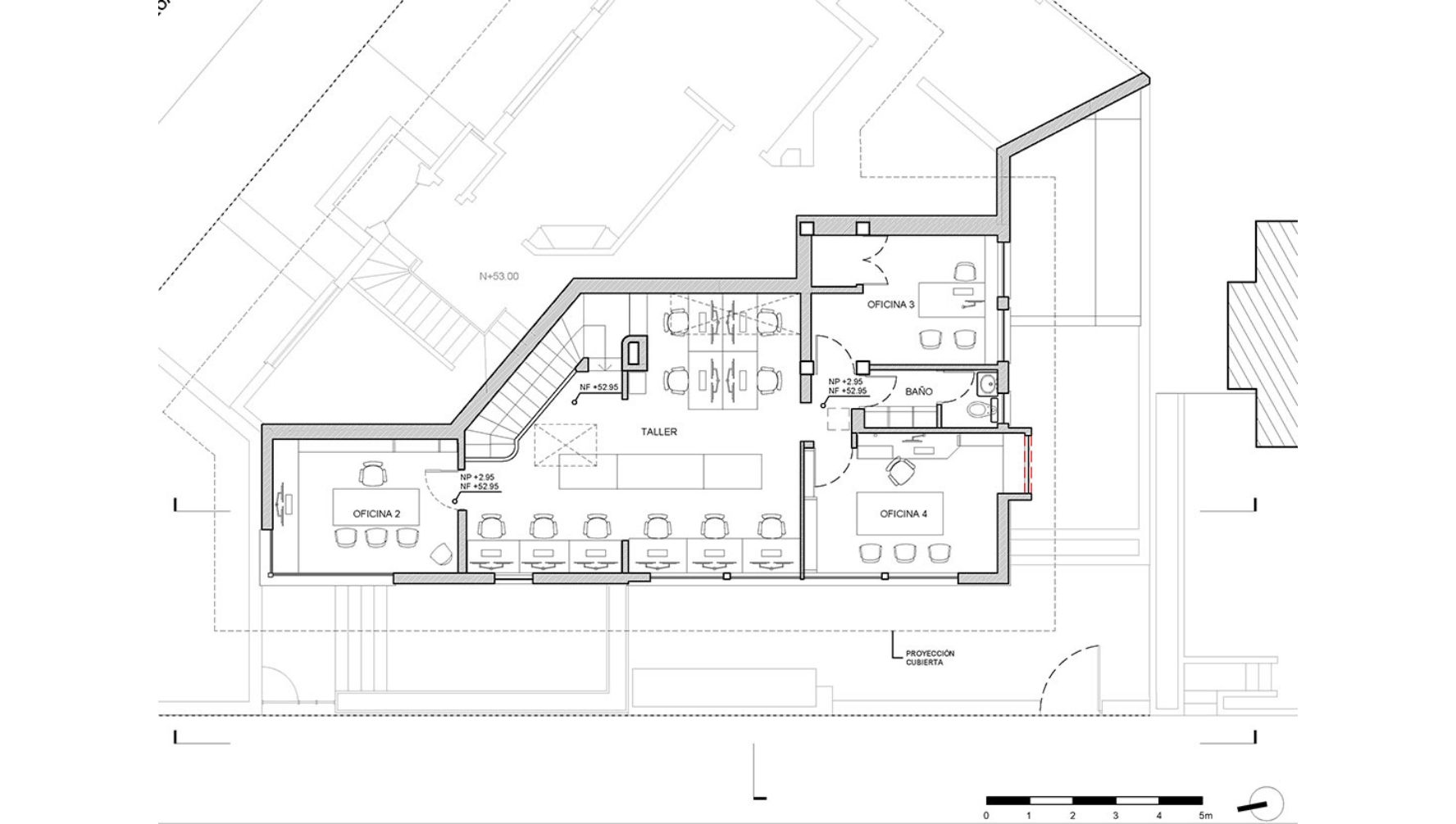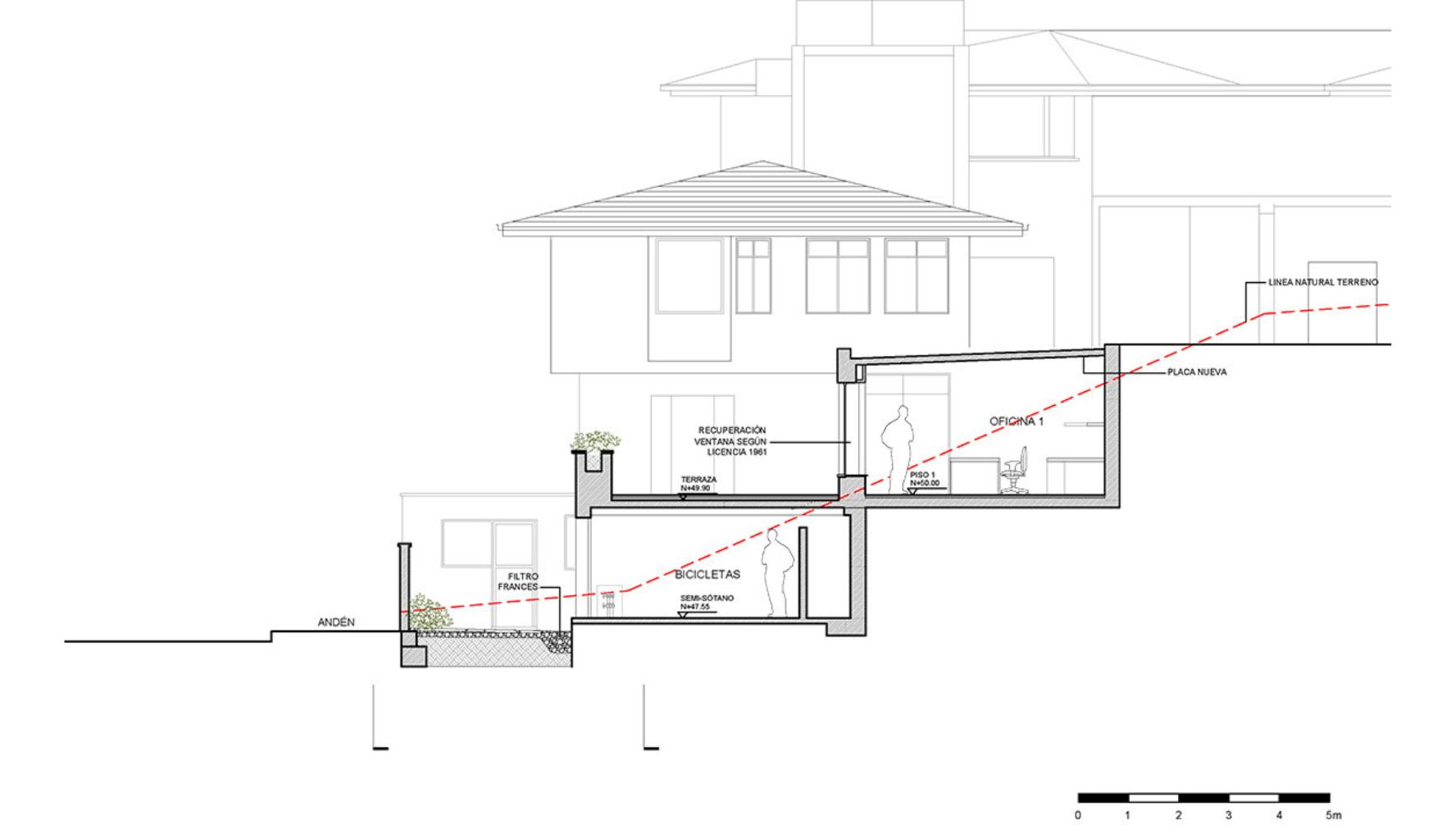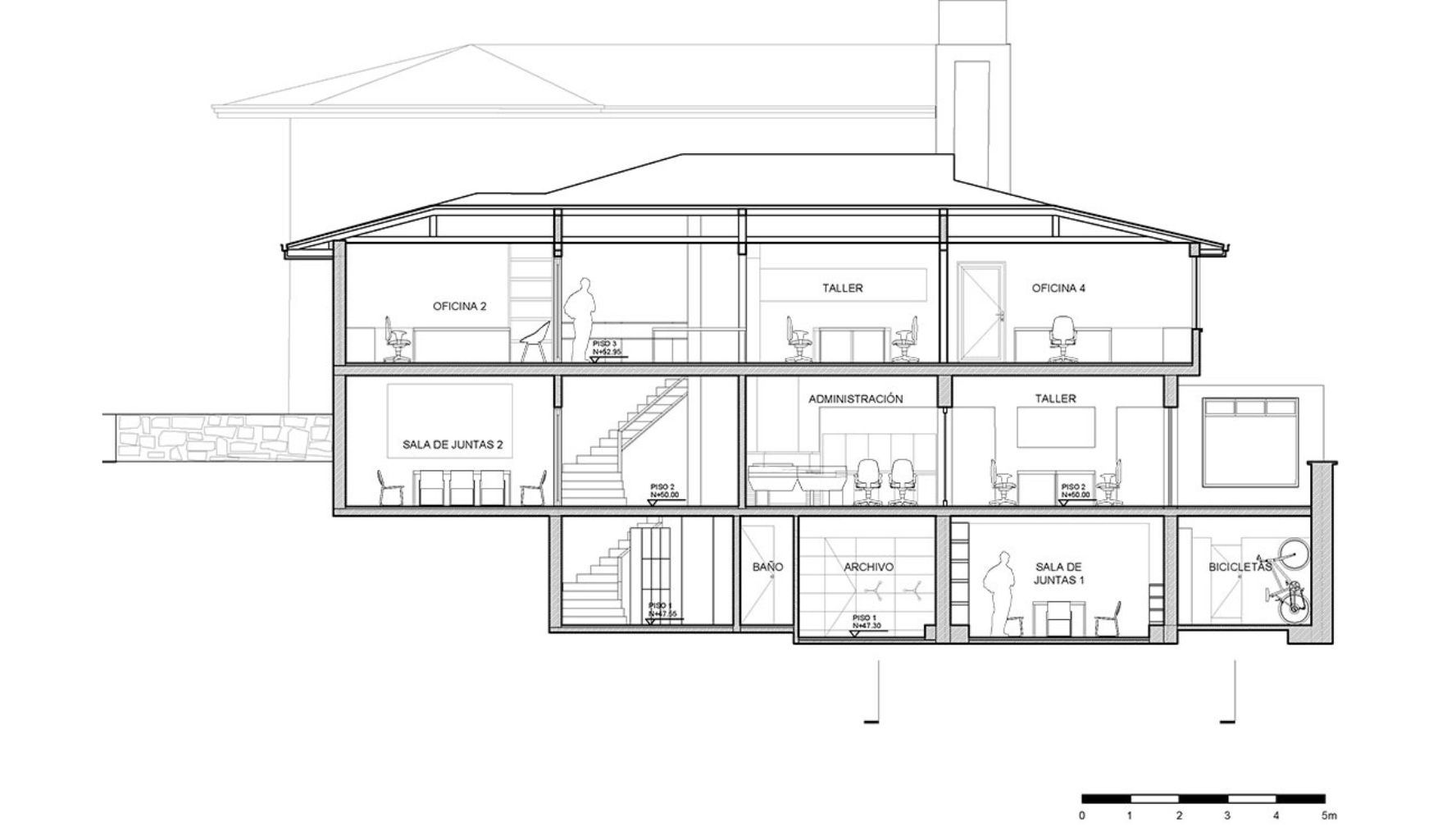 La adecuación del semisótano consistió en una adaptación de la cocineta existente para albergar una mesa más grande para albergar al equipo en el descanso del medio día, reubicando el mesón y aparatos. También se proyectó una zona de jardín extensa incluyendo una mesa exterior prefabricada y acceso directo al nuevo bicicletero en la zona del antejardín que había sido pavimentado y tomado como parqueadero. Por último, el antiguo garaje se adaptó como la nueva sala de juntas principal con modificaciones en las ventanas sobre fachada para garantizar condiciones óptimas de iluminación y ventilación de los espacios. El primer piso y acceso principal a la casa, sufrió modificaciones menores de demolición de muros que permitieron unificar los espacios y asegurar el buen funcionamiento de las áreas en su nuevo uso, incluyendo la recuperación de la ventana que hacía parte de la licencia original en el antiguo cuarto de ropas, ahora oficina privada. Las modificaciones del último nivel buscaron crear un espacio central y abierto, eliminando uno de los dos baños y los muros del cuarto principal para conformar esta área central, garantizando la iluminación y ventilación del espacio por medio de las ventanas de la fachada y dos lucernarios existentes recuperados. Las tres habitaciones restantes, fueron dispuestas como tres oficinas privadas en este nivel.
