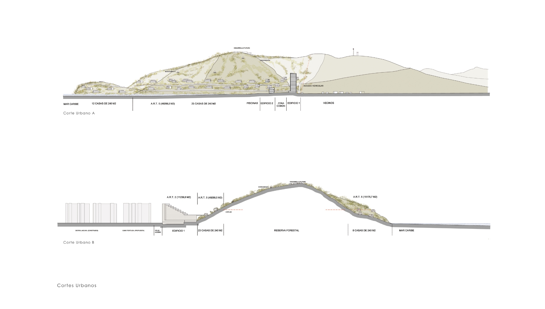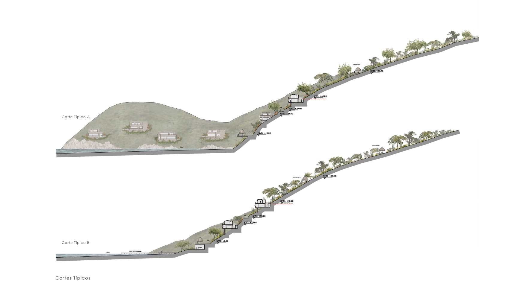 Estas dos tipologÃas comparten servicios hoteleros que permiten un mayor control sobre las circulaciones vehiculares restringidas, el lavado de ropa, la cocina, etc, disminuyendo asà los inmensos costos que significarÃa hacer por ejemplo una vÃa vehicular en un lote tan complicado. Además, el proyecto estarÃa inmerso en un mundo de zonas exteriores sin igual en la ciudad. En un lugar con tan poca agua, el recurso se vuelve precioso y es menester darle un manejo adecuado, revelando las fluctuaciones de las estaciones (seca y lluviosa) tan marcadas en esta región.