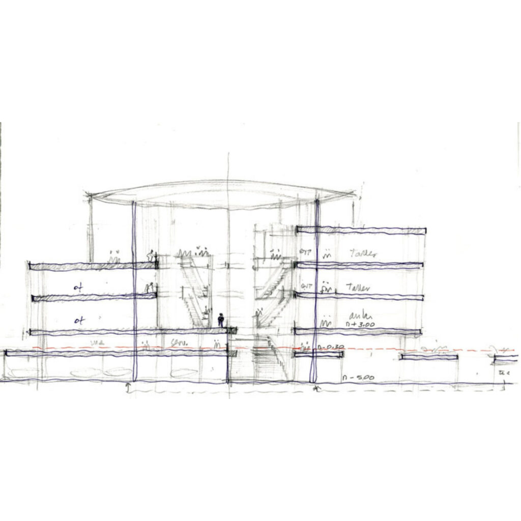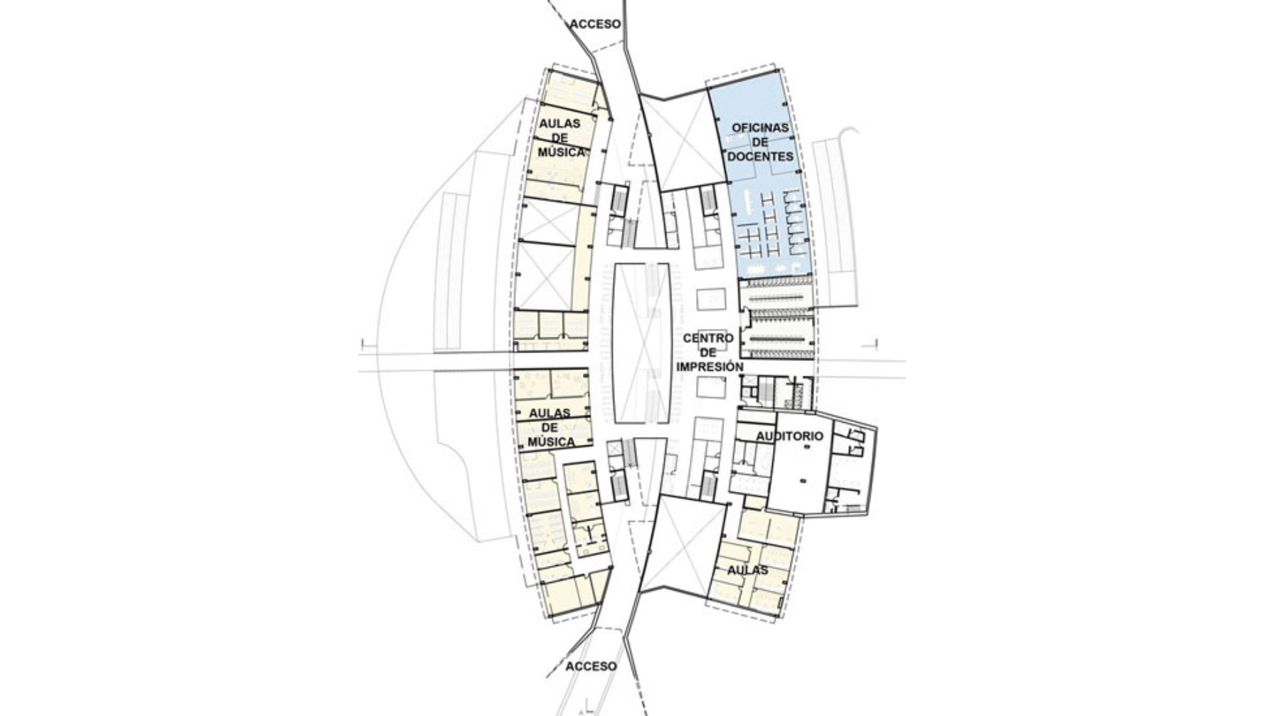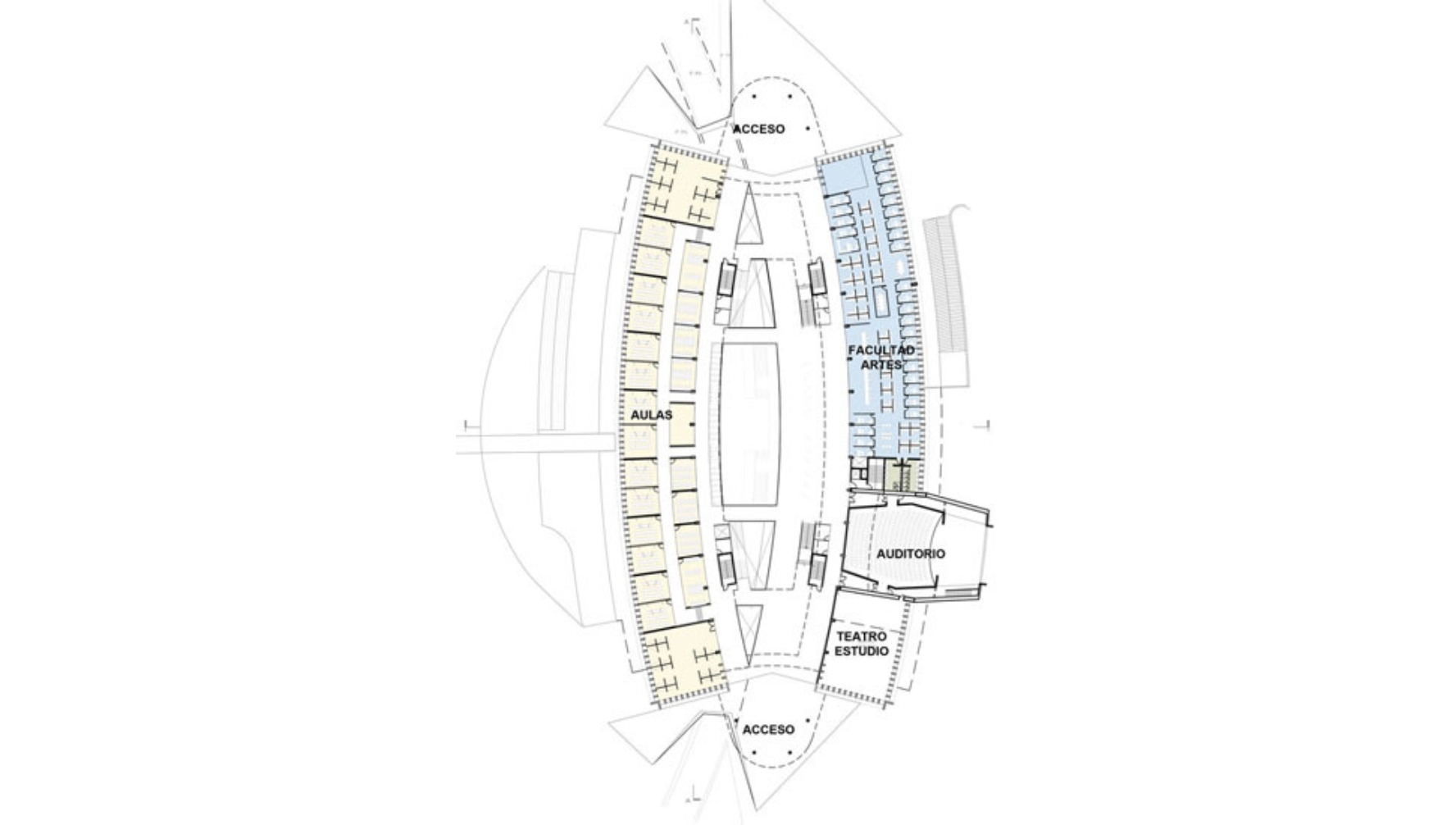 Tipológicamente el edificio evoca un teatro; sus balcones, un gran escenario y la cubierta, como una gran tramoya: el espacio de la representación. El encuentro de las diferentes comunidades ocurre en el espacio central, la gran terraza y las circulaciones del edificio, se consideran como los espacios que más tienen capacidad para enseñar los valores del arte. Se propone un espacio central el cual puede ser adaptado y modificado por los estudiantes con sus trabajos y montajes; dando como resultado un edificio en construcción permanente, porque atiende la educación como un proceso flexible y de constante cambio.