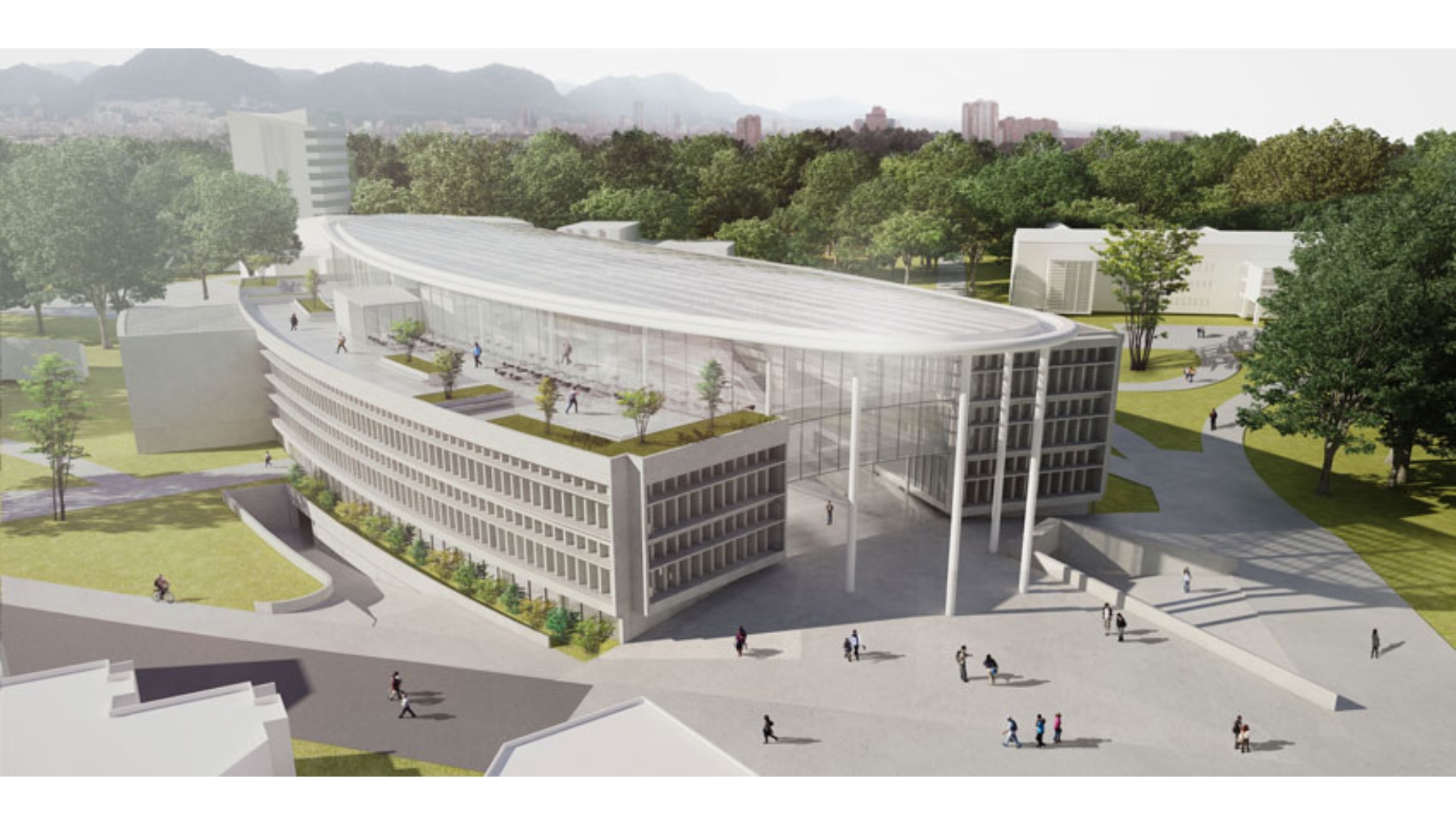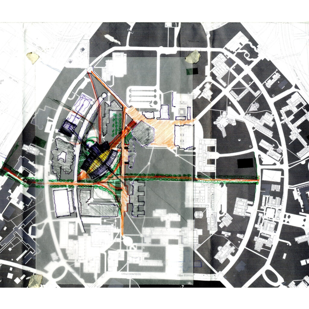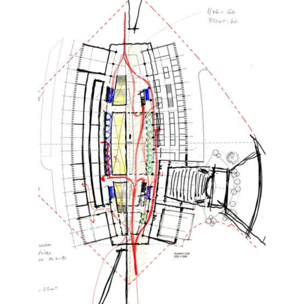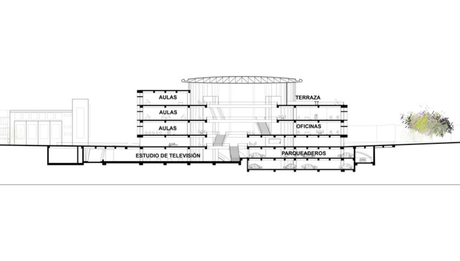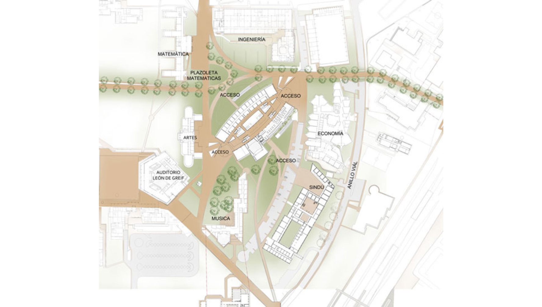 El edificio conecta las sendas peatonales existentes para darle continuidad a la circulación del campus, de esta forma el edificio se presenta permeable visualmente y peatonalmente en diversas formas. Privilegia el uso del espacio abierto para los peatones en lugar de los vehículos; en un campus donde predomina el espacio libre, tan escaso en la ciudad.