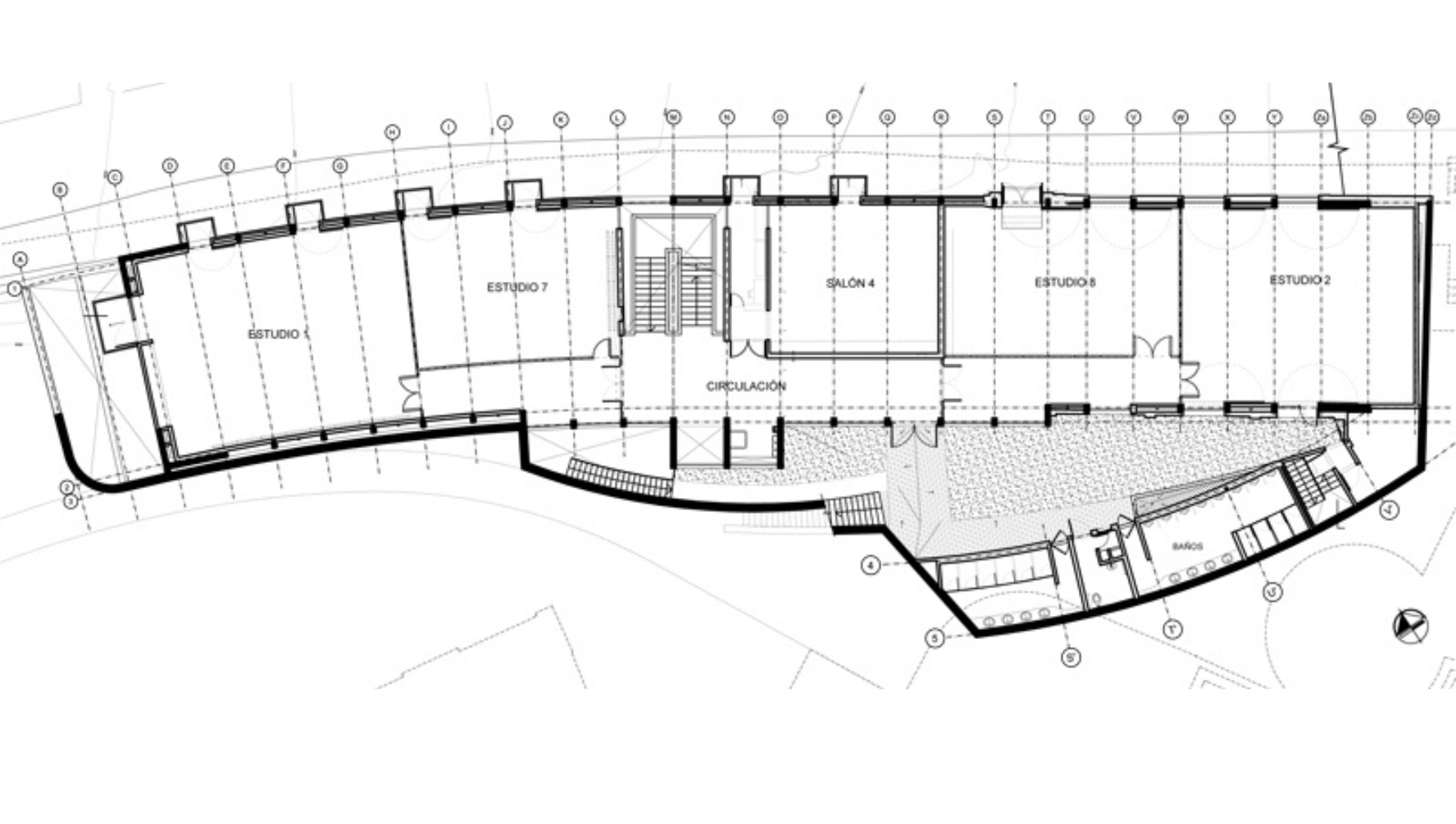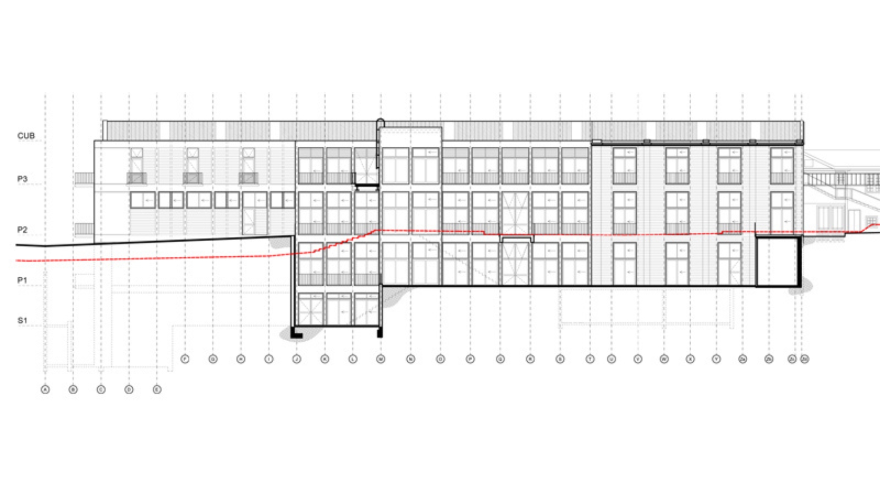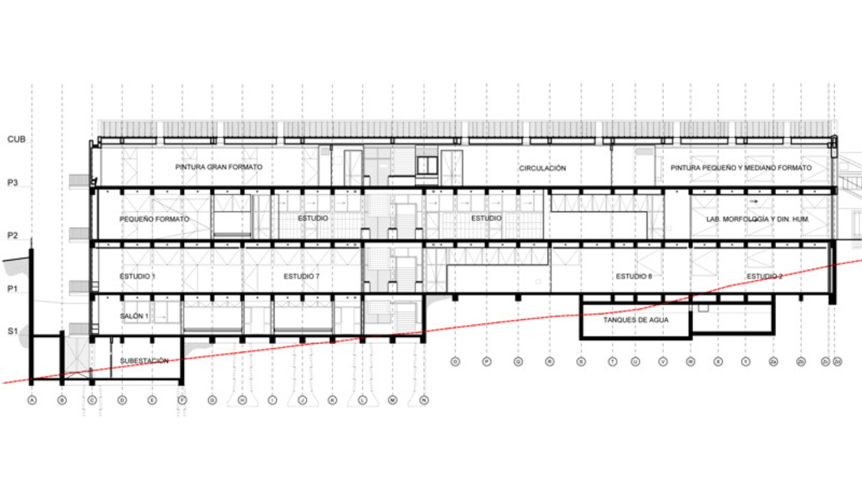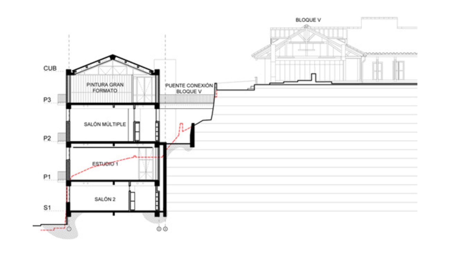 El existente Bloque S1 es demolido y la nueva construcción continúa la volumetría del bloque R, mediante una estructura en concreto ocre que da estabilidad al conjunto. Se integra espacial y funcionalmente con el Bloque R y utiliza un lenguaje con proporciones y materiales similares a los existentes. Un sistema de tráfico vertical sirve a todos los pisos que se conectan con los diferentes niveles del contexto inmediato.