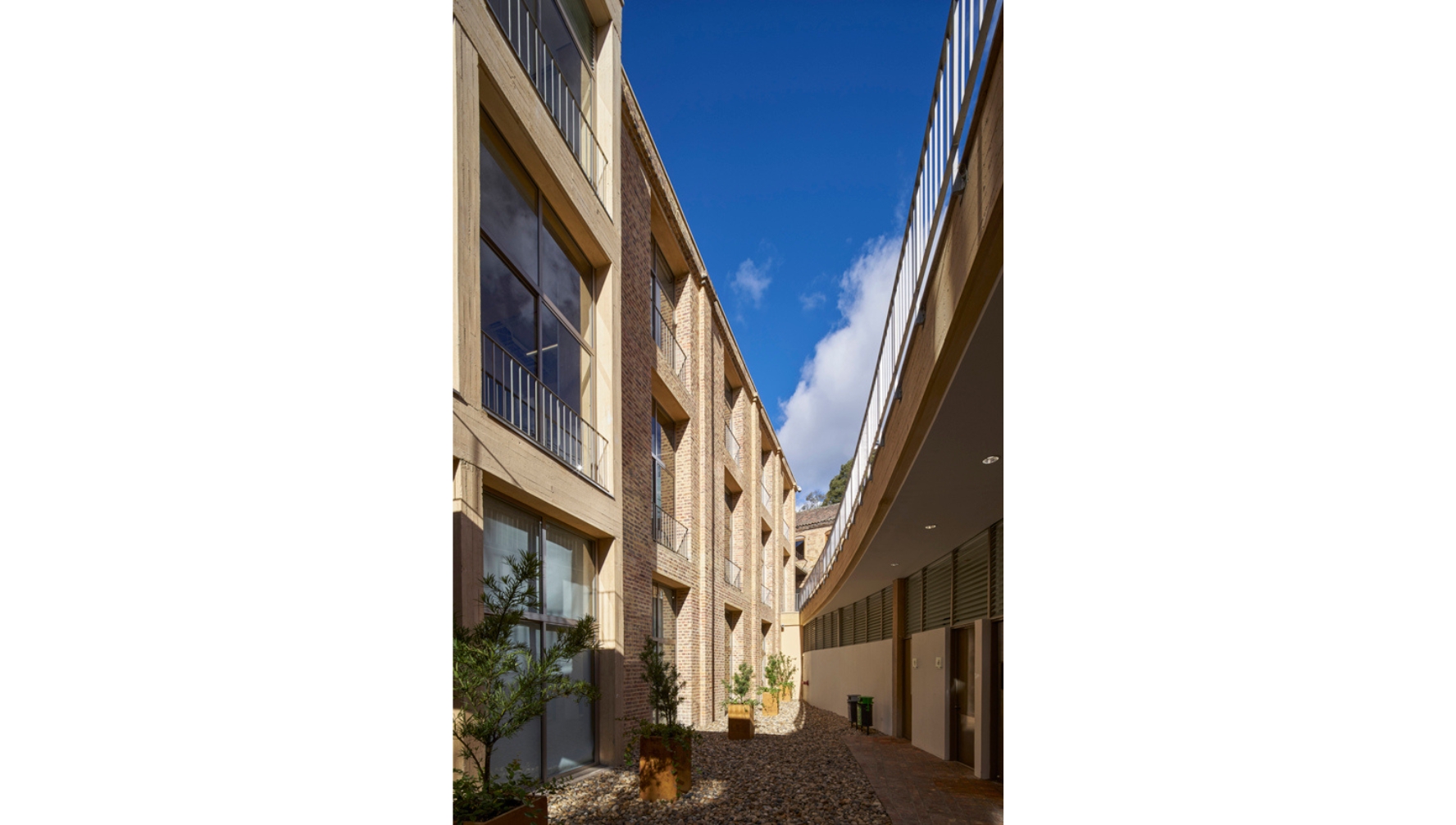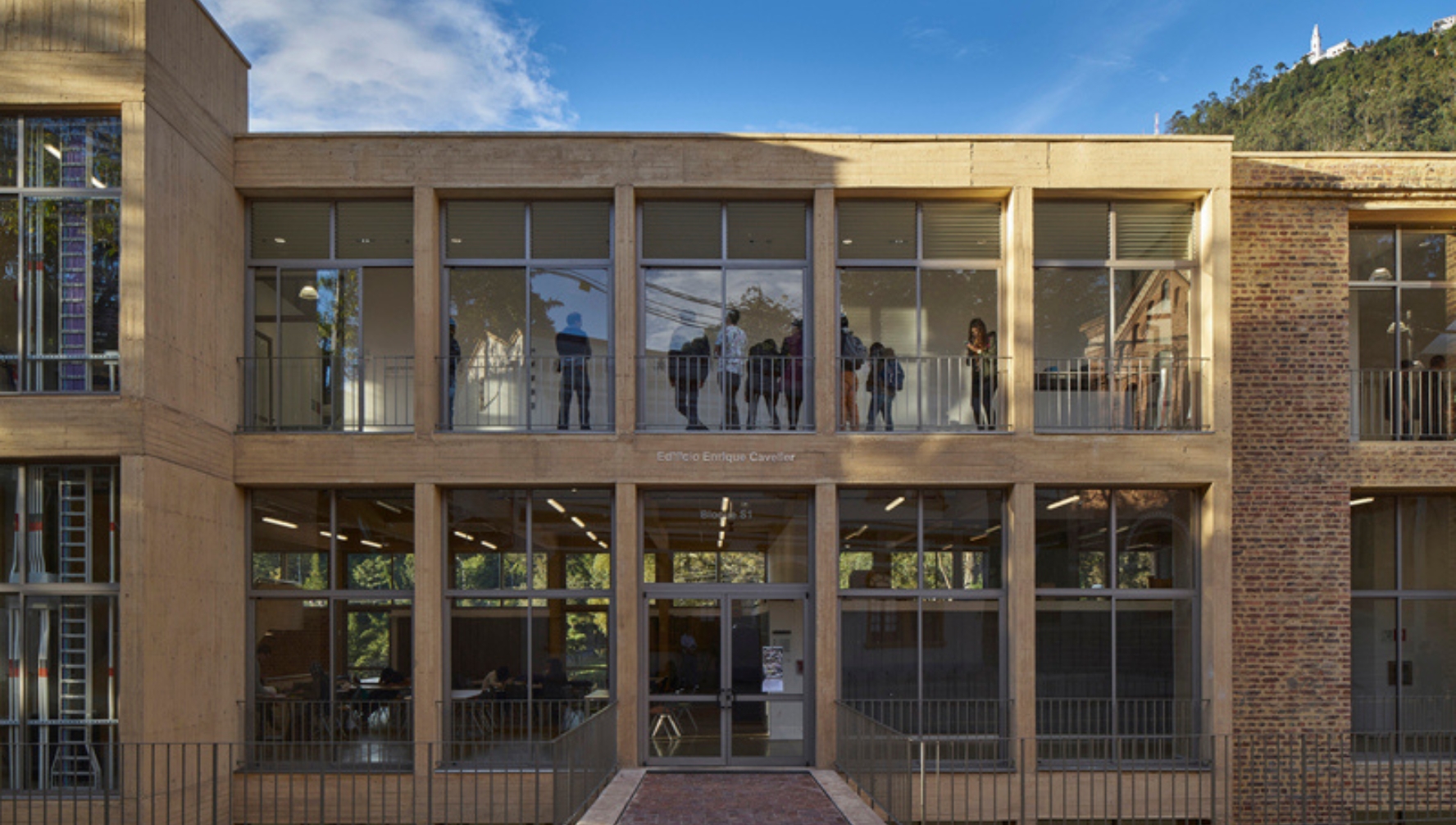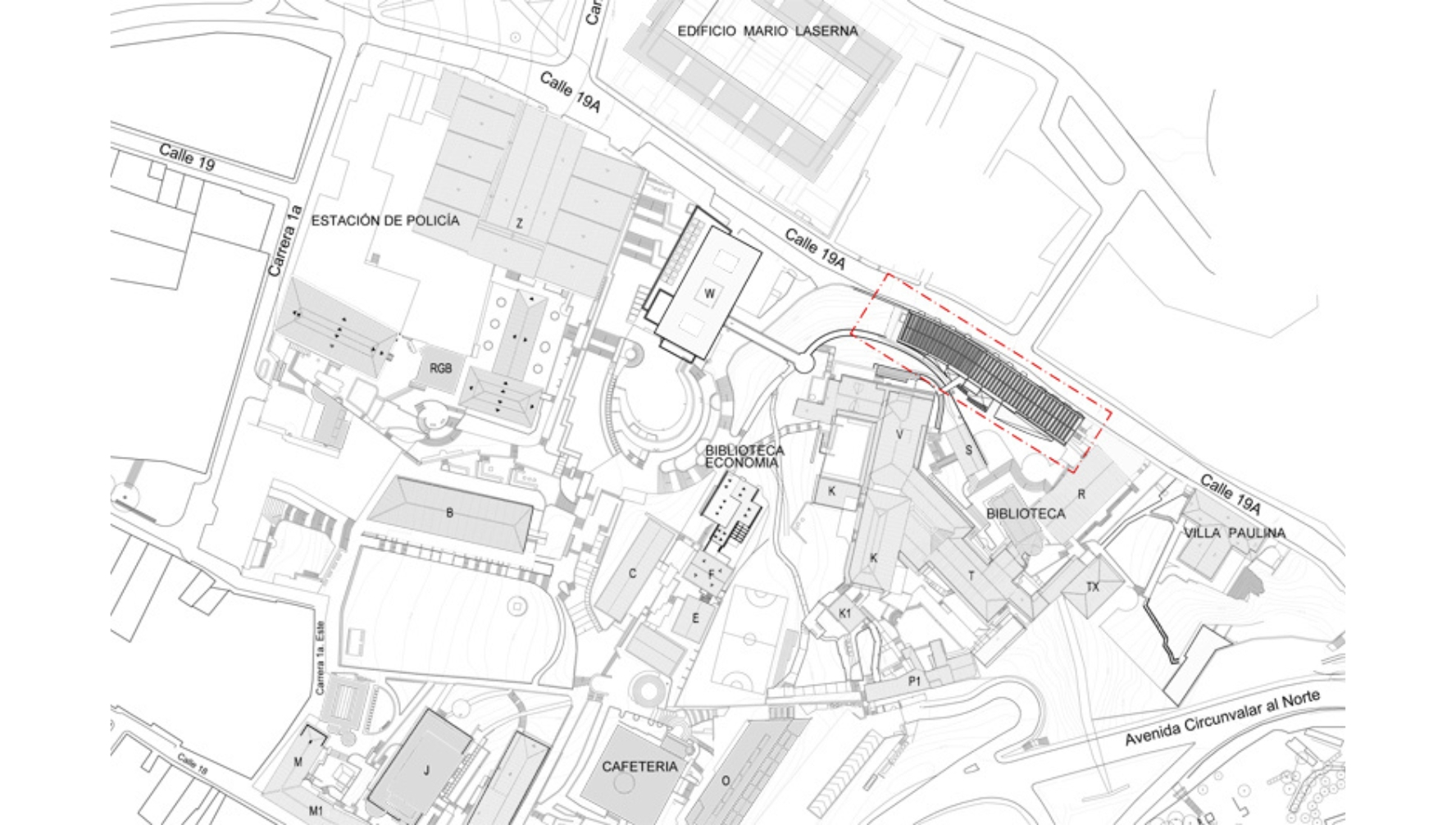 Hacia el interior del campus, la fuerte inclinación del terreno se maneja con un patio de acceso, trayendo luz y ventilación a los pisos inferiores, una zona de servicios sanitarios bajo la plazoleta Richard. Frente a la fachada urbana de la calle 19A, la construcción paramenta el eje y genera mayor actividad sobre este tramo de la calle. Volumétricamente, consolida la calle y define la perspectiva urbana del lugar.