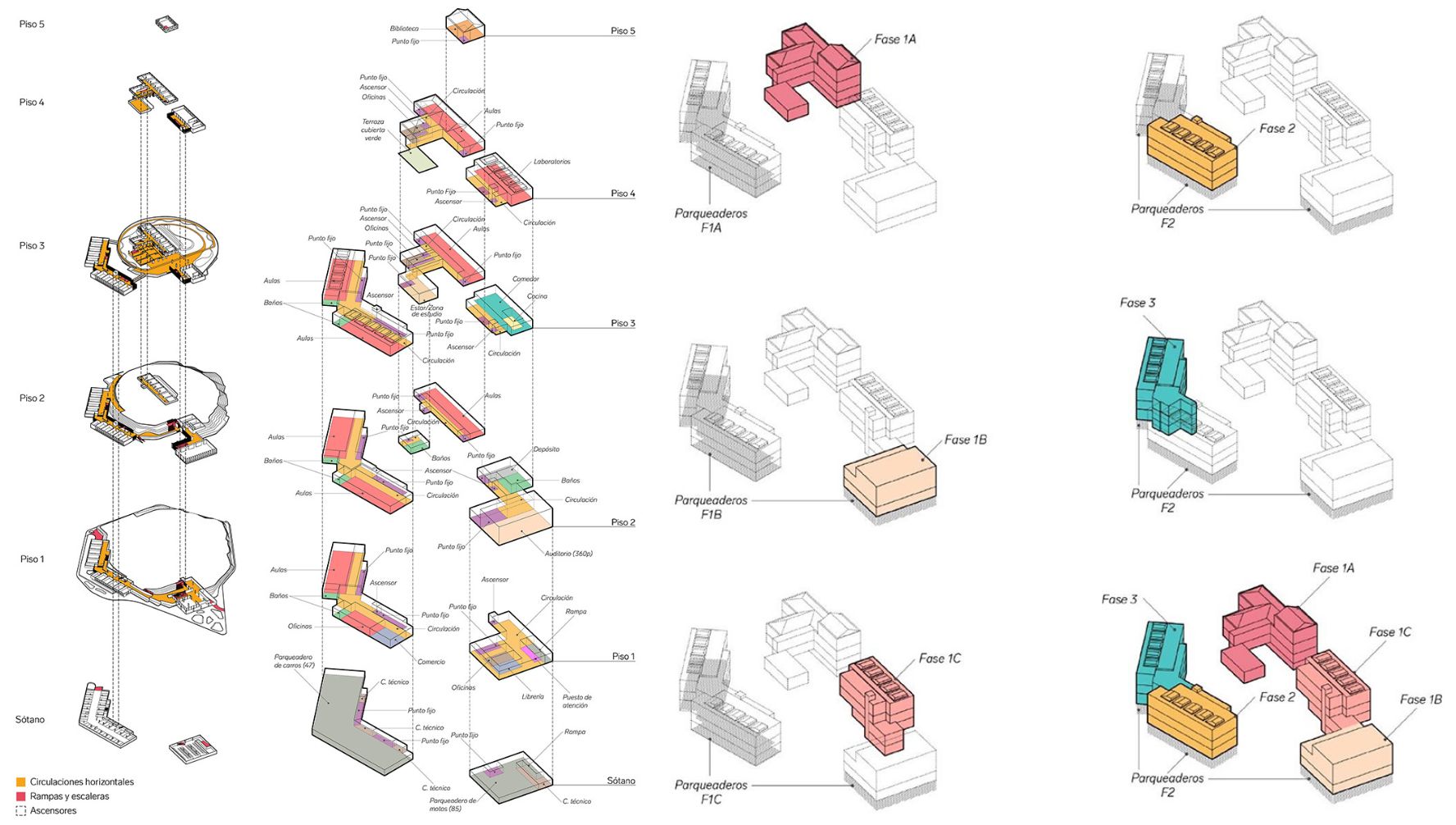 El proyecto se desarrolla en 3 fases. En primer lugar, se acomete la adecuación del entorno y el edificio existente, para esto se interviene la actual vía de acceso al molino para volverla peatonal y estructurante del nuevo campus, así como crear andenes , accesos vehiculares y una plaza de ingreso peatonal que organicen el borde del predio y su contacto con la ciudad circundante. Paralelo a esto se plantea la respectiva restauración y rehabilitación del Molino que albergará los talleres de arquitectura, las zonas de estudio y una biblioteca entre otros. Posteriormente se proyectan dos edificios nuevos. Uno junto a la plaza de acceso que tendrá la recepción, oficinas, una librería y un auditorio; y otro para los laboratorios y la cafetería. Finalmente, en las fases 2 y 3 se desarrollarán dos edificios de aulas.