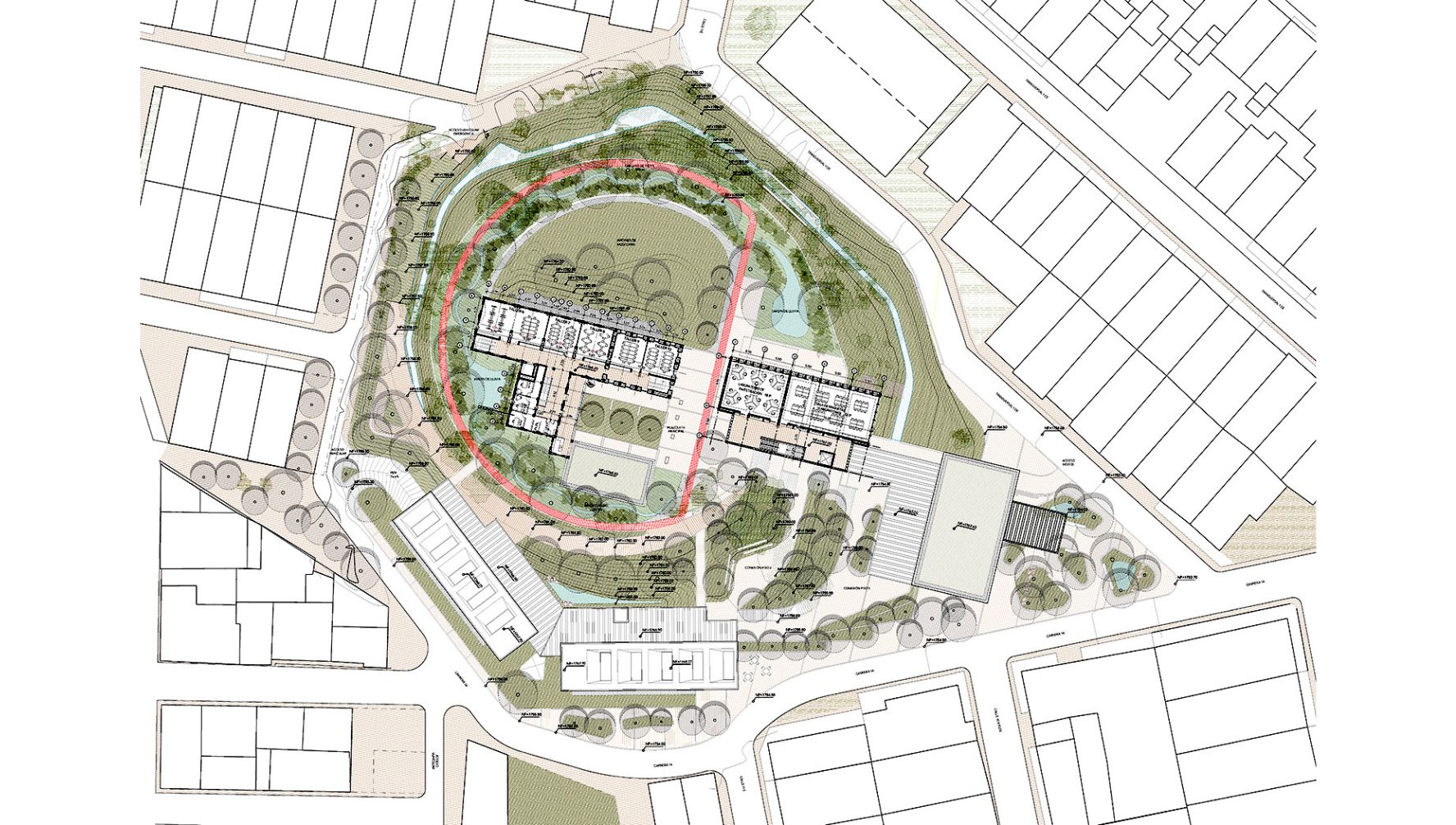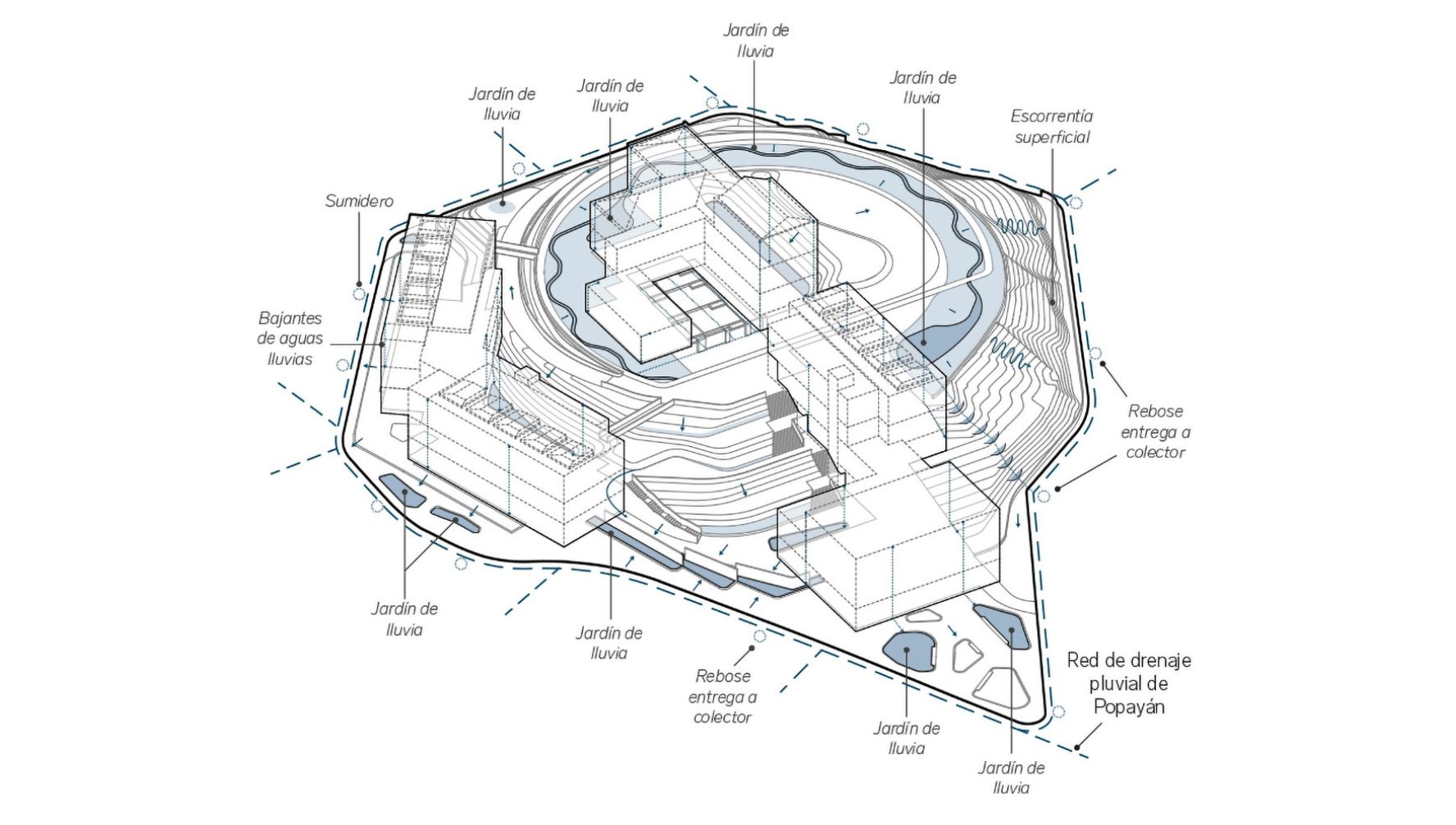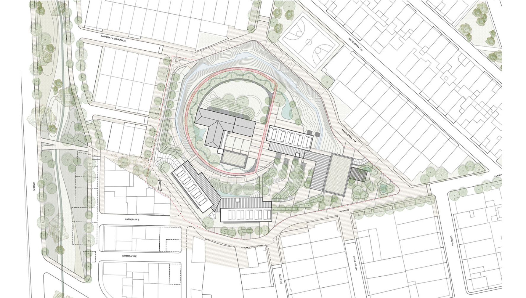 La implantación de los edificios nuevos está pensada de tal manera que no opaquen al molino y continúe siendo el elemento más visible del entorno. Por otro lado, el proyecto se desarrolla a partir de varios edificios sueltos como una manera de aprovechar topografía inclinada del terreno creando conexiones en diferentes niveles a través del espacio abierto. Para esto, se plantean una series de plazas, escaleras y zonas de circulación que cuentan con su propio programa complementario a las actividades de la universidad. Así mismo, todos los edificios se localizan en la trasera del edificio patrimonial con respecto a la visual desde el centro para preservar esa relación existente y aprovechar para construir un gran jardín vegetado en forma de oasis urbano.