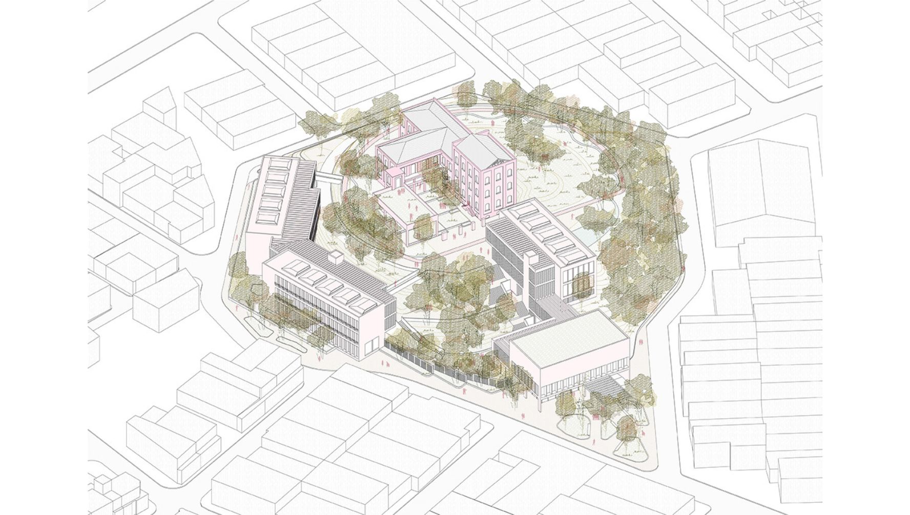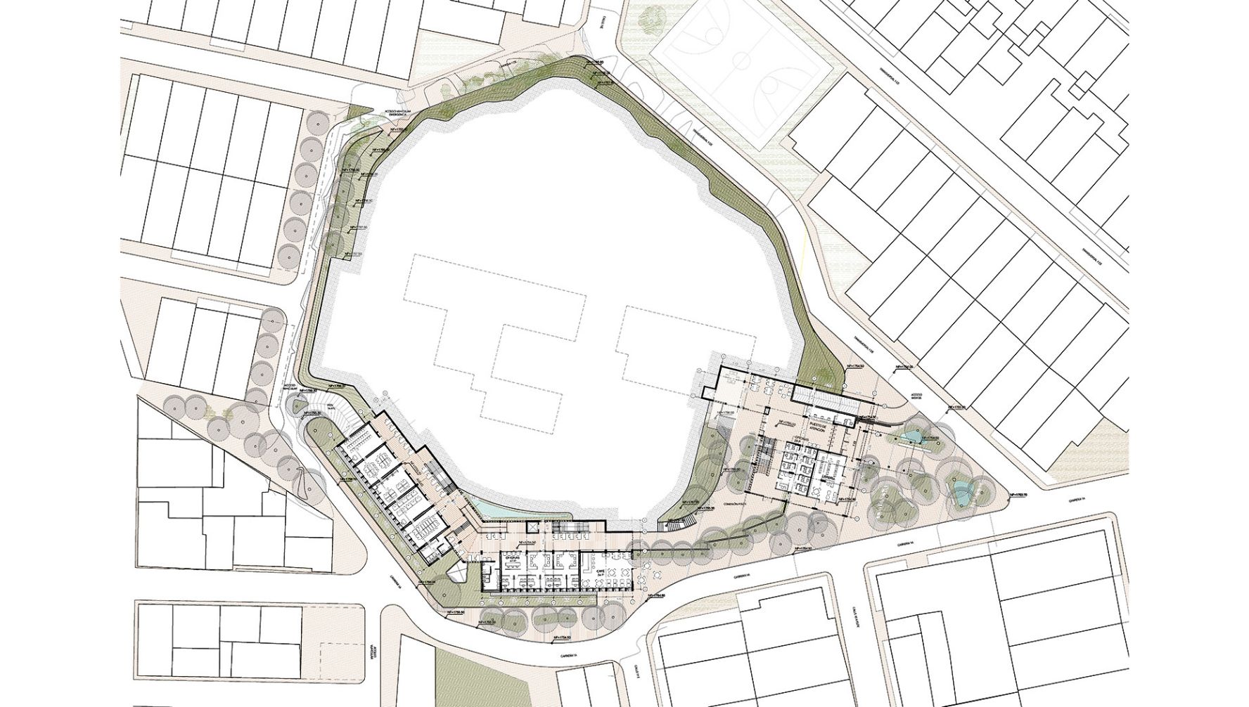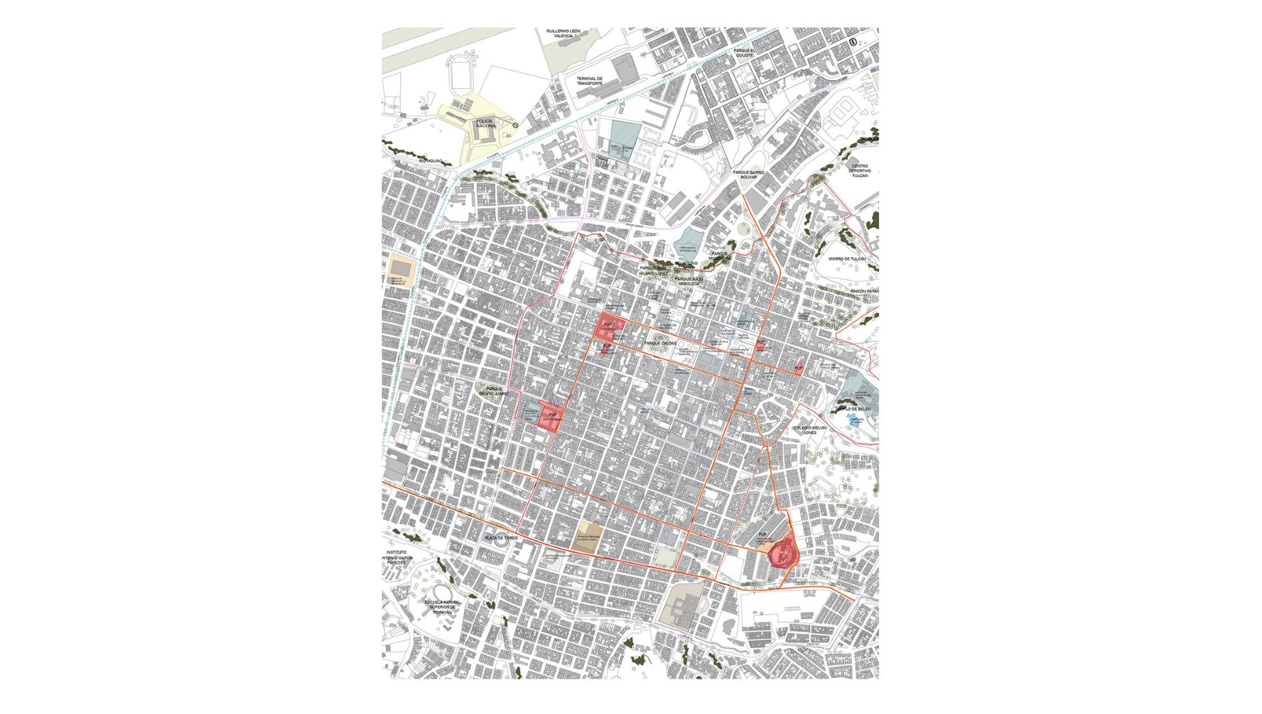 La implantación de los edificios nuevos está pensada de tal manera que no opaquen al molino y continúe siendo el elemento más visible del entorno. Por otro lado, el proyecto se desarrolla a partir de varios edificios sueltos como una manera de aprovechar topografía inclinada del terreno creando conexiones en diferentes niveles a través del espacio abierto. Para esto, se plantean una series de plazas, escaleras y zonas de circulación que cuentan con su propio programa complementario a las actividades de la universidad. Así mismo, todos los edificios se localizan en la trasera del edificio patrimonial con respecto a la visual desde el centro para preservar esa relación existente y aprovechar para construir un gran jardín vegetado en forma de oasis urbano.