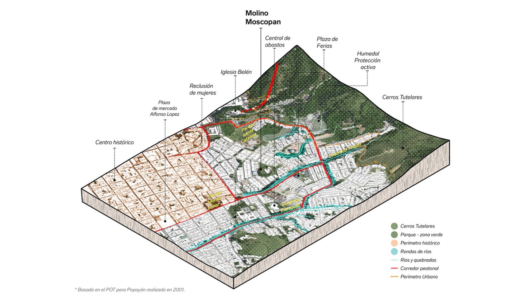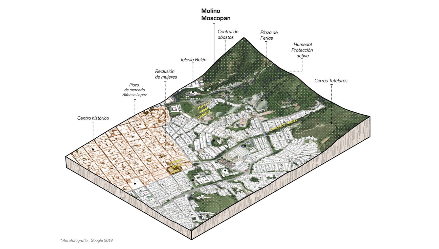 El proyecto para la nueva Facultad de arquitectura y arte de la Fundación Universitaria de Popayán (FUP) parte de la rehabilitación y adecuación de una preexistencia que hace parte del imaginario colectivo de la ciudad, conocida como el Molino Moscopan. Construido en 1926, el molino fue la sede de la empresa procesadora de harina de trigo Moscopan, de ahí su nombre. Sin embargo, debido a una crisis durante los años 70s` el molino cerró sus puertas permanentemente provocando su deterioro con el paso de los años. A pesar de llevar más de 50 años abandonado y sobrevivir al terremoto de 1983, el molino aún se conserva junto a sus máquinas de madera importadas de Estados Unidos. Por otro lado, gracias a su cercanía al centro histórico de Popayán y al estar en un terreno que se eleva en relación a su contexto, el molino se ha convertido en un punto de referencia para los payaneses. Recientemente la FUP adquirió el predio con la idea de rehabilitar el edificio y construir la sede de Arquitectura y Artes.