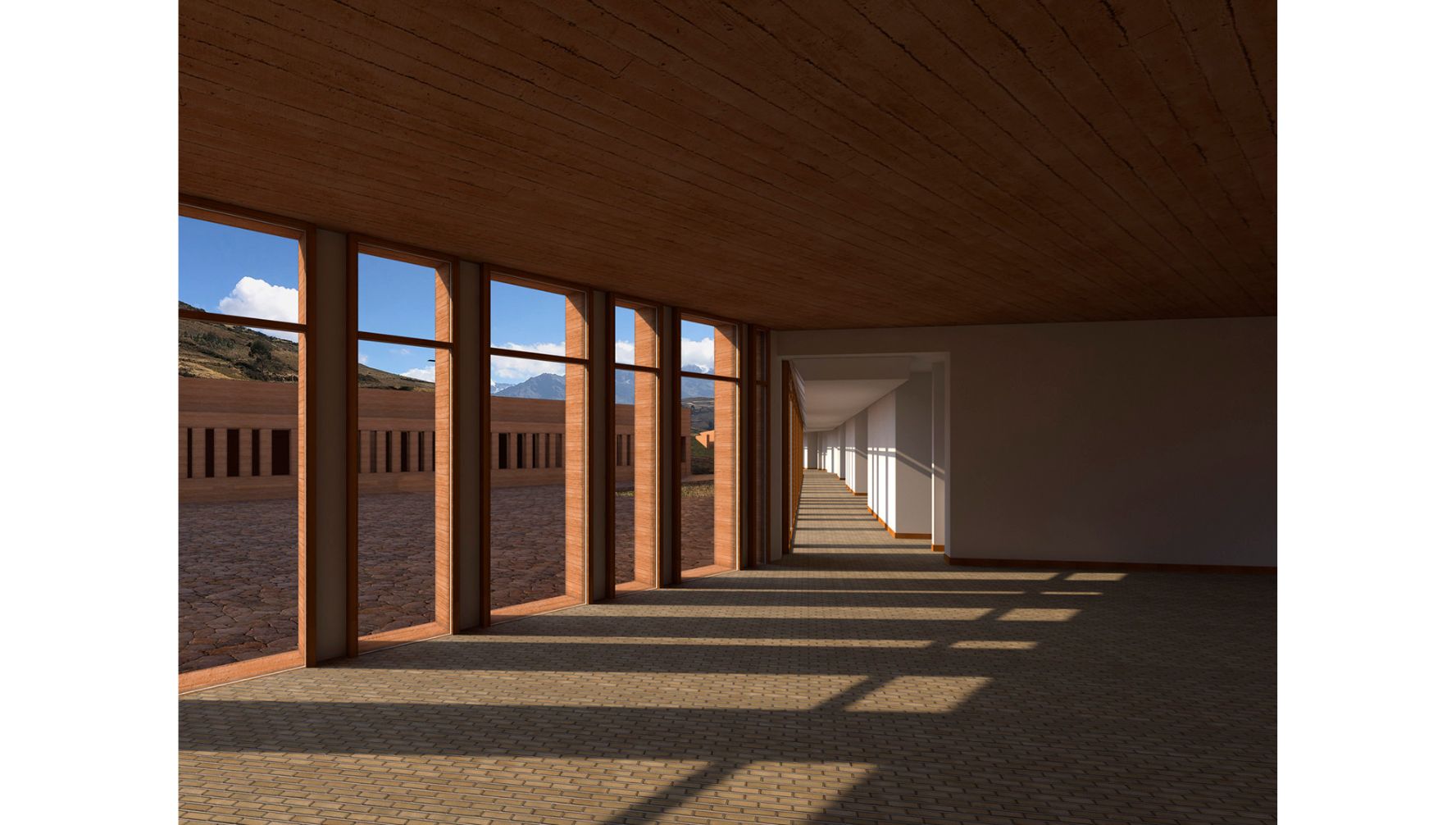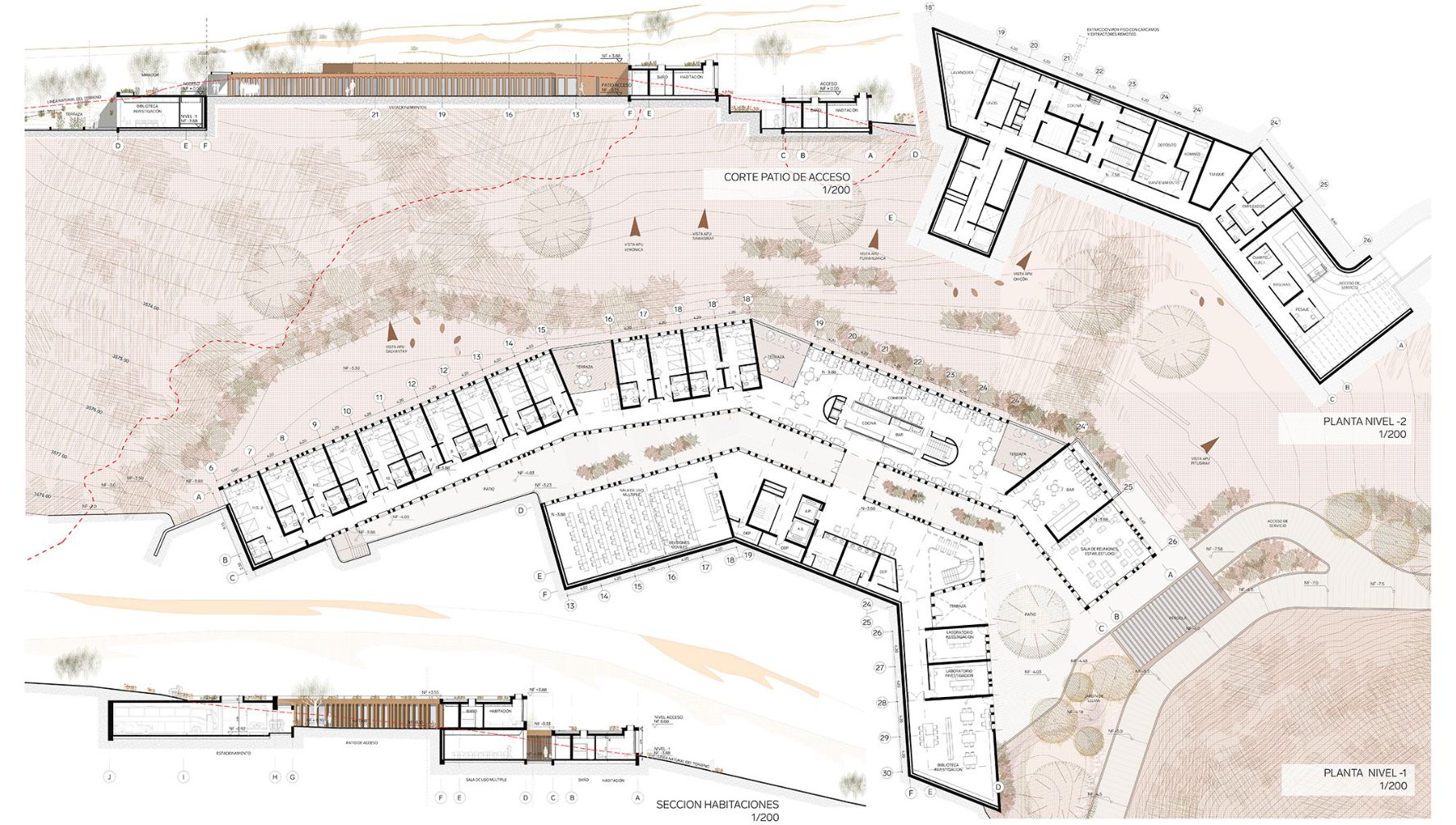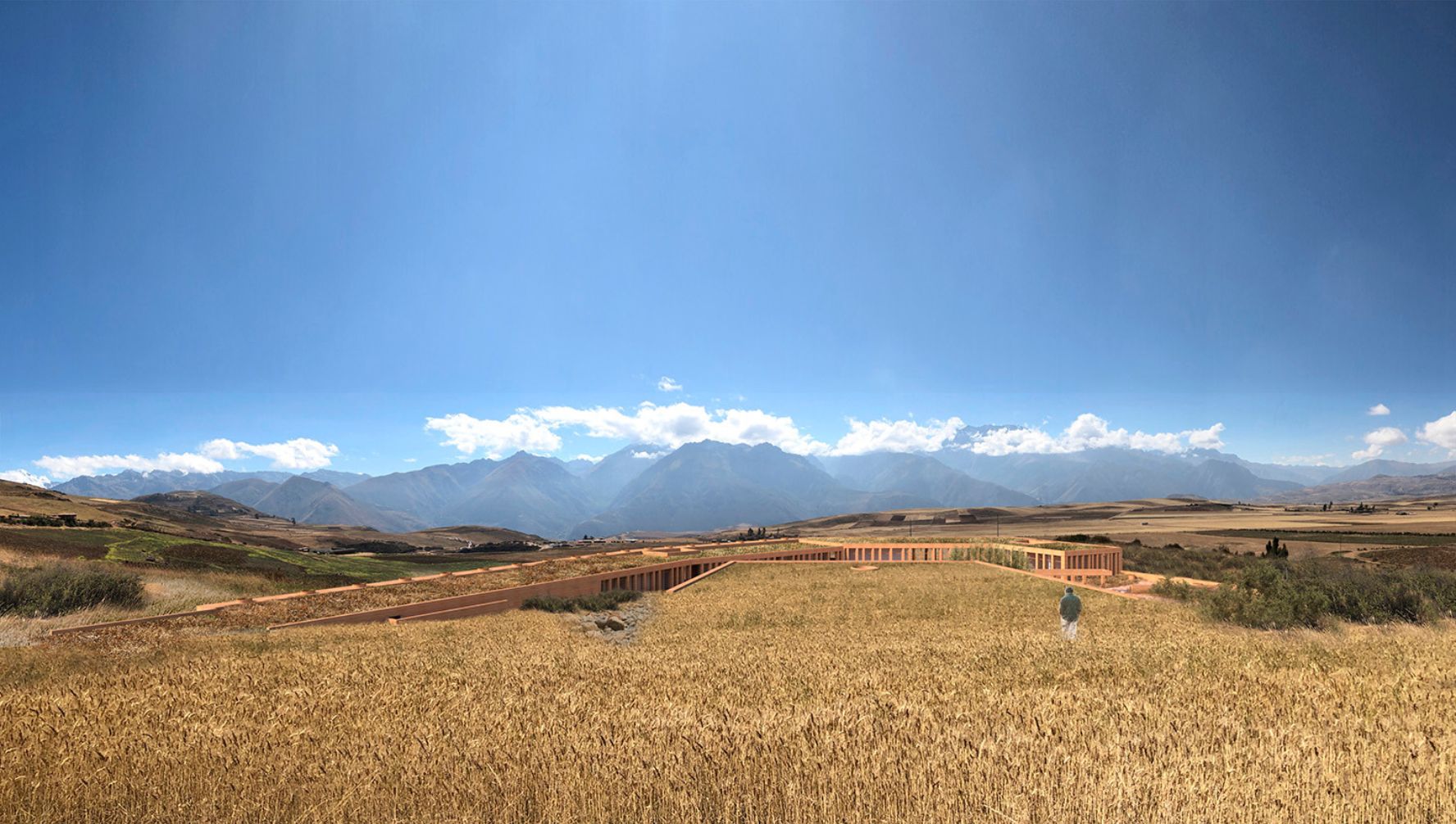La domesticación del entorno a través de terrazas y chacras propios de la cultura Inca perdura hasta nuestros días como vestigios arqueológicos, pero también como una forma de construir los lugares habitables. A partir de esta idea, nos interesa una interpretación topográfica del lugar como una forma de generar un continuo espacial con el contexto y la historia del lugar. Así las cosas, nuestra propuesta busca ofrecer el máximo aprovechamiento de las visuales, con un esquema horizontal semienterrado que se mimetizará en la topografía, y no será evidente pero si muy atractivo. Esta condición lineal horizontal y abierta hacia las vistas también permite una asoleación adecuada que calentará los espacios importantes del proyecto.