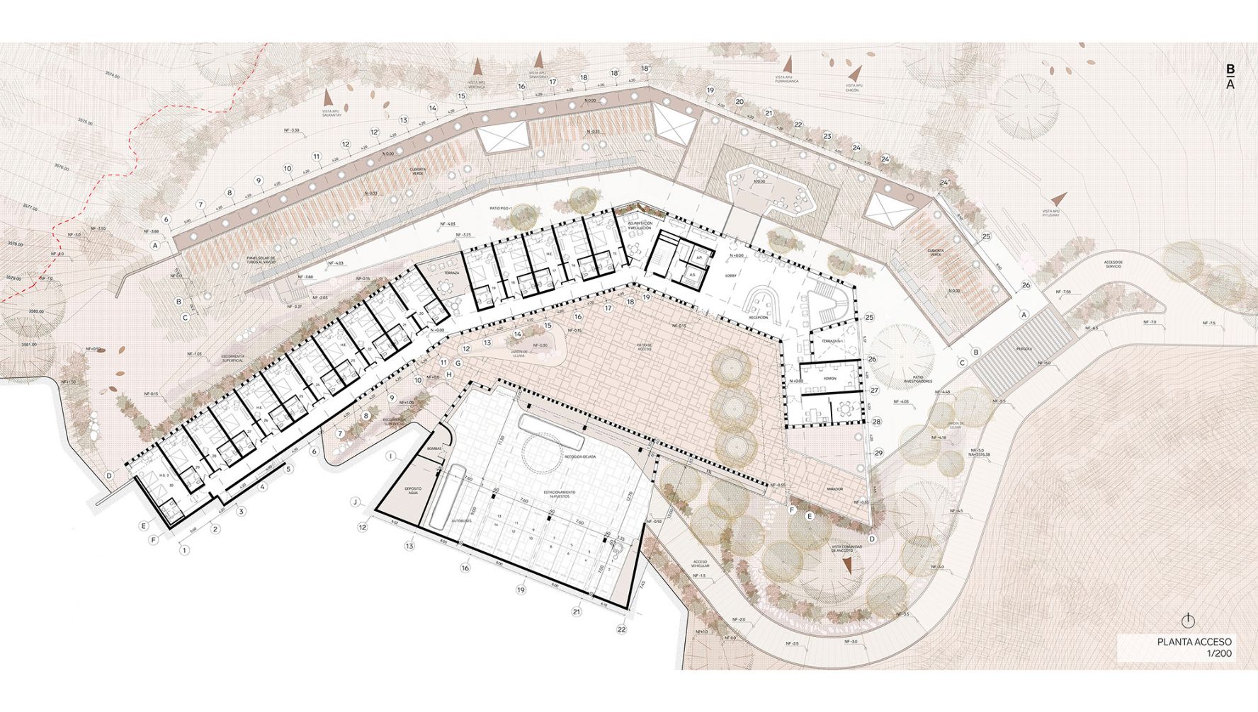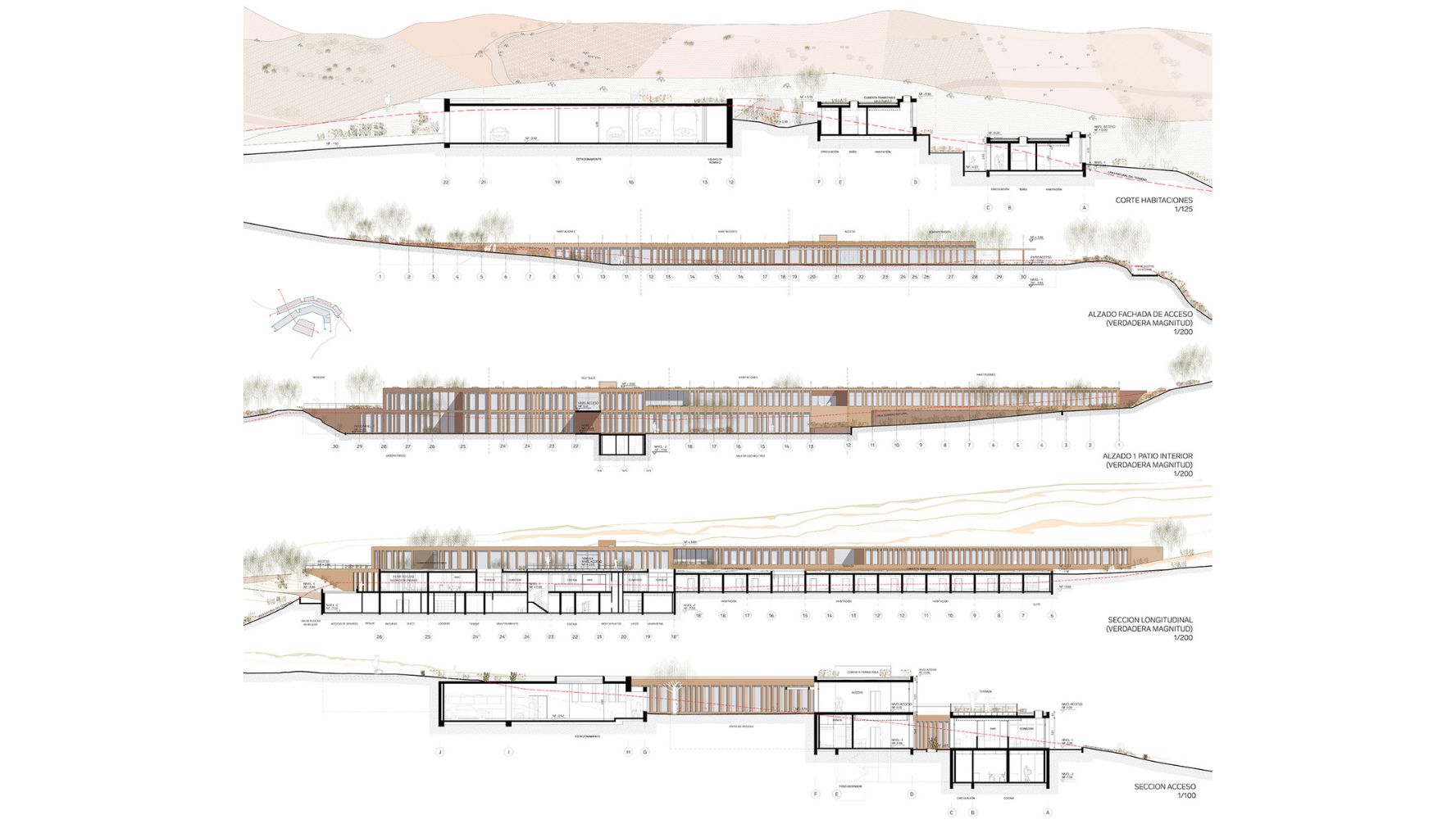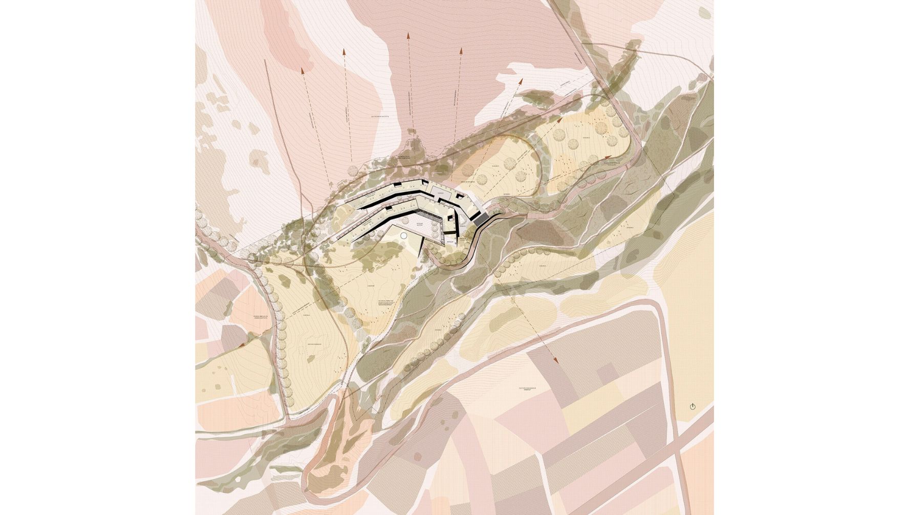 La domesticación del entorno a través de terrazas y chacras propios de la cultura Inca perdura hasta nuestros días como vestigios arqueológicos, pero también como una forma de construir los lugares habitables. A partir de esta idea, nos interesa una interpretación topográfica del lugar como una forma de generar un continuo espacial con el contexto y la historia del lugar. Así las cosas, nuestra propuesta busca ofrecer el máximo aprovechamiento de las visuales, con un esquema horizontal semienterrado que se mimetizará en la topografía, y no será evidente pero si muy atractivo. Esta condición lineal horizontal y abierta hacia las vistas también permite una asoleación adecuada que calentará los espacios importantes del proyecto.